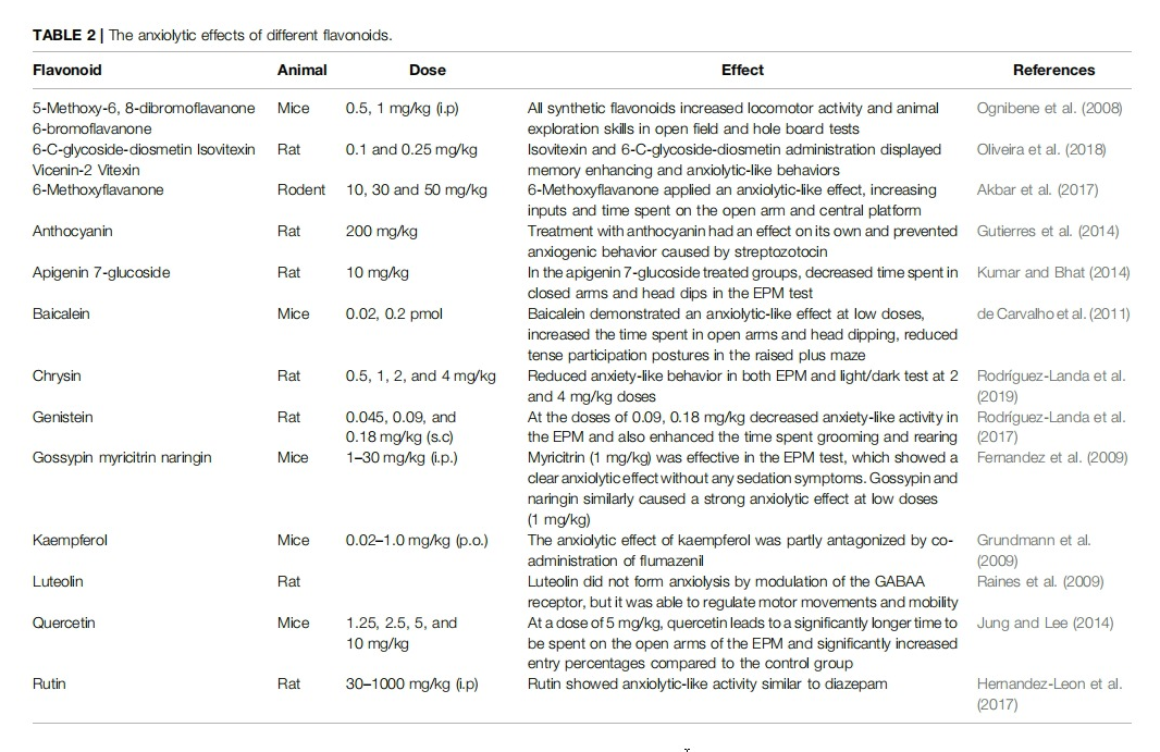 With many studies, the use of these flavonoids, which have an antioxidative nature, has been proven to be beneficial, in particular, to reduce symptoms of depression by different mechanisms. These mechanisms are: 1) regulation of different neurotransmitters such as dopamine, serotonin, and norepinephrine, 2) antioxidant characteristics, 3) anti inflammatory effect, 4) capacity to regulate the activity of MAO enzyme, and 5) effect on neurotransmitter receptor