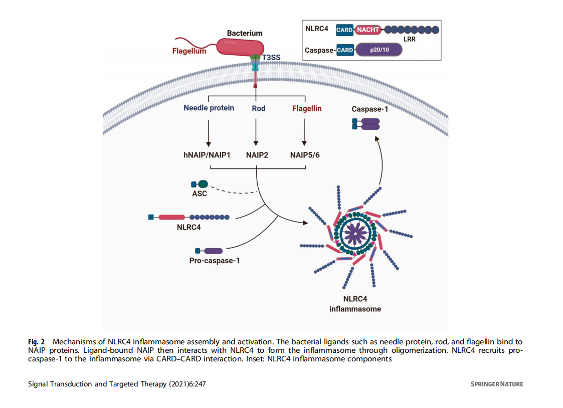NLRC4 contains a CARD domain, therefore can directly recruit pro-caspase-1.26 The NLRC4 inflammasome mainly responds to bacterial flagellin and components of the bacterial type III secretory system (T3SS). Certain NLRC4-mediated functions may not require ASC, but do require interactions with the NLR family of apoptosis inhibitory proteins (NAIPs) which are receptors for bacterial protein ligands, and these interactions determine inflammasome specificity (Fig. 2).37,38 There are four NAIPs in mice: NAIP1 binds to the needle protein, NAIP2 detects rod proteins, and NAIP5/6 interact with flagellin.39–42 There is only one NAIP in humans, and it interact with the needle protein Cprl.42 In light of these findings, NLRC4 may be specific for the needle protein rather than flagellin in human infectious disease. AIM2 is part of the inflammasome that can induce caspase-1 activation and subsequent cleavage of IL-1β and IL-18, contribut ing to the immune reaction against bacterial and viral infection.