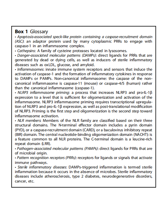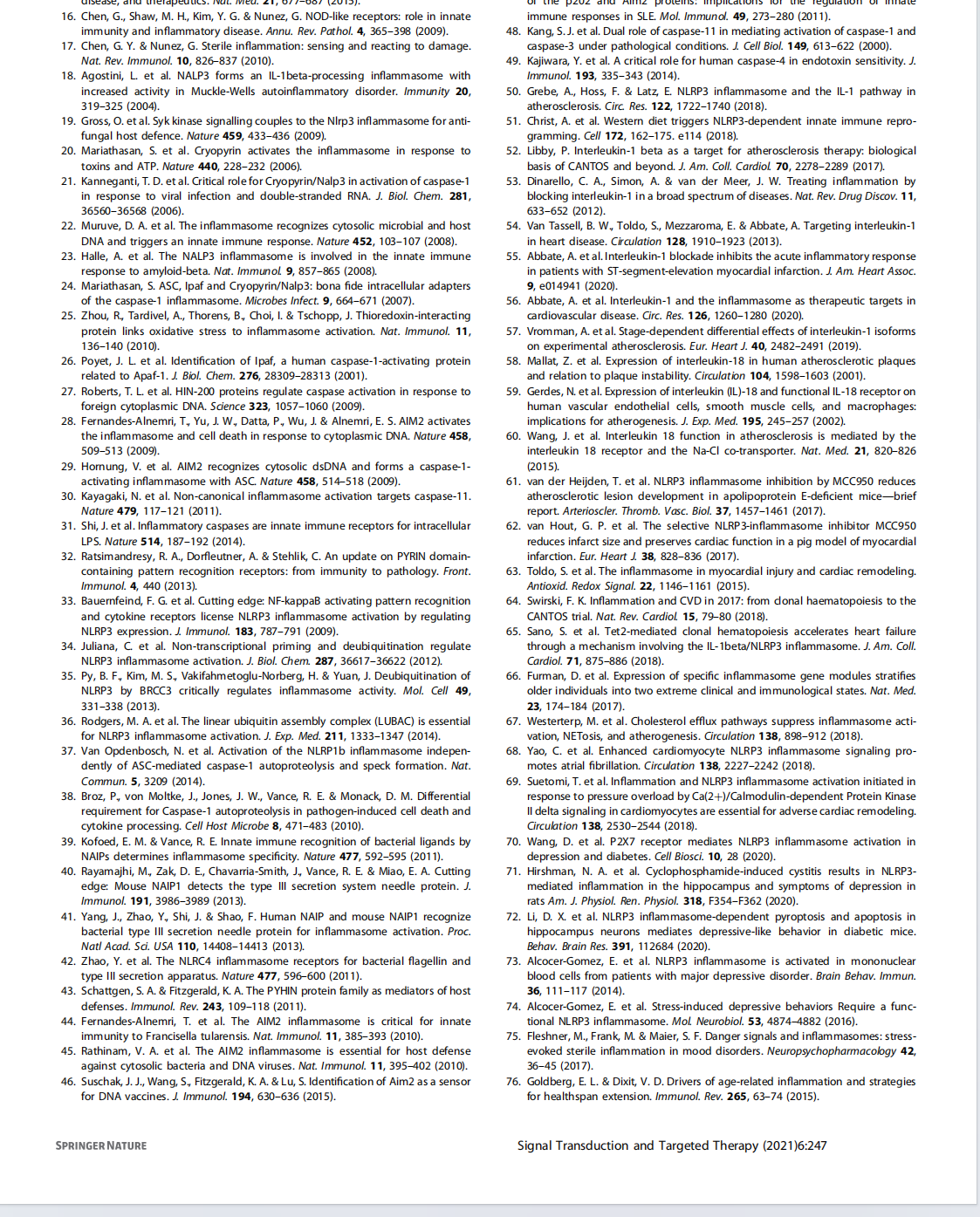 Inflammasomes and atherosclerosis. IL-1β was one of the first cytokines implicated in the pathogenesis of atherosclerosis. Various NLRP3 inflammasome stimuli that induce the production of mature IL-1β have been shown to contribute to the formation of atherosclerotic plaques.50 The NLRP3–IL-1β pathway has been identified as part of the innate immune memory system because it is a form of “trained immunity”, leading to a robust immune response to secondary infection.
