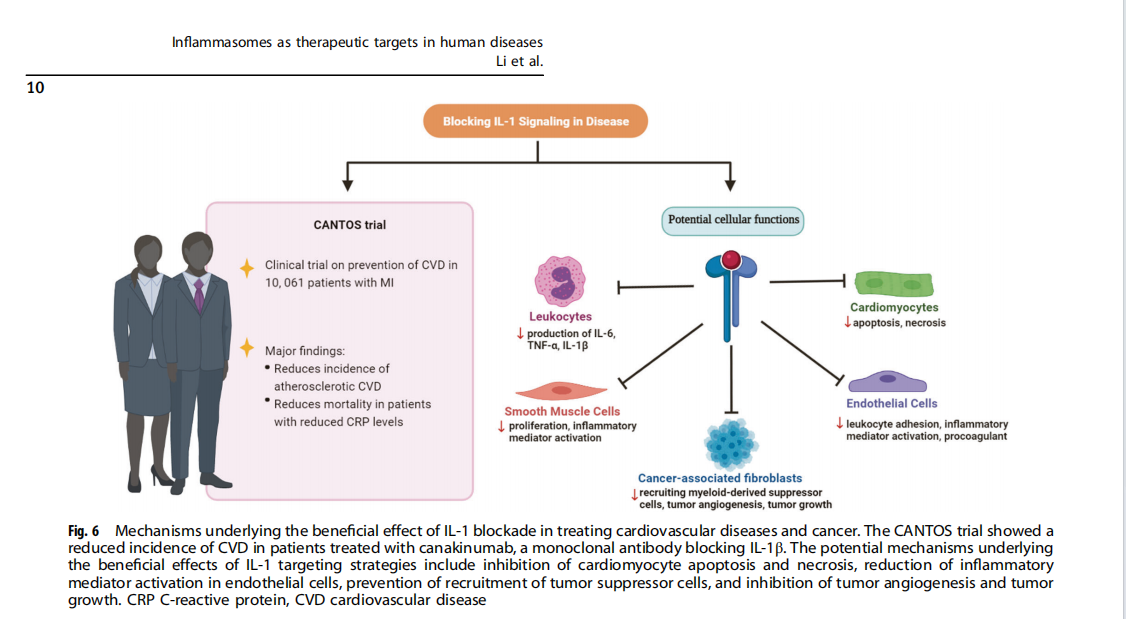 As strategies targeting IL-1 enter clinical trials, we face new challenges as well as opportunities. The CANTOS trials confirmed that inflammasome activation is the cause rather than a consequence of atherothrombosis. This is an important step toward the clinical application of therapeutic strategies targeting the inflammasome signaling pathway. However, the trial als revealed an increased incidence of fatal infection due to off-target effects, which must be properly addressed before canakinumab can be routinely used to prevent cardiovascular events. To solve this problem, Li et al.169 introduced PMs as carriers to deliver the IL-1β antibody to the injured heart and demonstrated promising results. This approach not only reduces the risk of side-effects but also improves therapeutic efficiency.