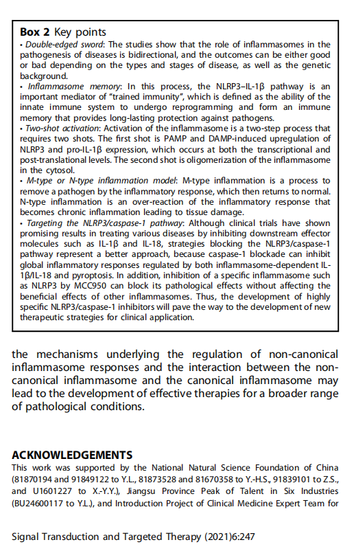 Inflammasomes are protein complexes of the innate immune system that initiate inflammation in response to either exogenous pathogens or endogenous danger signals. Inflammasome multiprotein complexes are composed of three parts: a sensor protein, an adaptor, and pro-caspase-1. Activation of the inflammasome leads to the activation of caspase-1, which cleaves pro-inflammatory cytokines such as IL-1β and IL-18, leading to pyroptosis. Effectors of the inflammasome not only provide protection against infectious pathogens, but also mediate control over sterile insults. Aberrant inflammasome signaling has been implicated in the development of cardiovascular and metabolic diseases, cancer, and neurodegenerative disorders. Here, we review the role of the inflammasome as a double-edged sword in various diseases, and the outcomes can be either good or bad depending on the disease, as well as the genetic background. We highlight inflammasome memory and the two-shot activation process. We also propose the M- and N-type inflammation model, and discuss how the inflammasome pathway may be targeted for the development of novel therapy. Signal Transduction and Targeted Therapy (2021) 6:247 ; https://doi.org/10.1038/s41392-021-00650-z