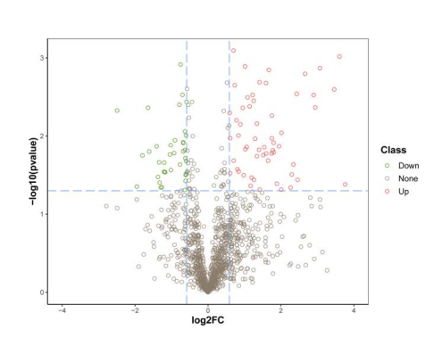 Conventional data dependent acquisition (DDA) mass spectrometry was used to establish and analyze a spectral library of human volar skin proteins obtained from 20 healthy subjects, i.e. 10 young and 10 elderly Chinese individuals. As a result, 9005 peptides and 1631 proteins were identified. Supplementary Table 1 lists the details of the proteins produced by DDA. Next, we adopted the data independent acquisition (DIA) method for mass spectrometry data collection. The details of the proteins identified and quantified by DIA are shown in Supplementary Table 2. After calculating the fold difference and P value through the MSstats package, 1270 proteins were further identified (Supplementary Table 3). Fold change ≥ 1.5 and P <0.05 were used as the screening criteria for significantly differentially expressed proteins (DEPs). Compared with the young (control) group, a total of 95 proteins were differentially expressed in the elderly (experimental) group. Among these DEPs, 57 were upregulated and 38 were downregulated (Figure 1). These DEPs were used to draw a cluster analysis chart (Figure 2), which intuitively reflected expression differences between the two groups. Principal component analysis (PCA) showed that the DEPs segregated into two separate clusters that can distinguish the young group from the elderly group (Supplementary Figure 1). Functional categorization and UniProt information for the upregulated and downregulated DEPs are provided in Tables 1 and 2, respectively