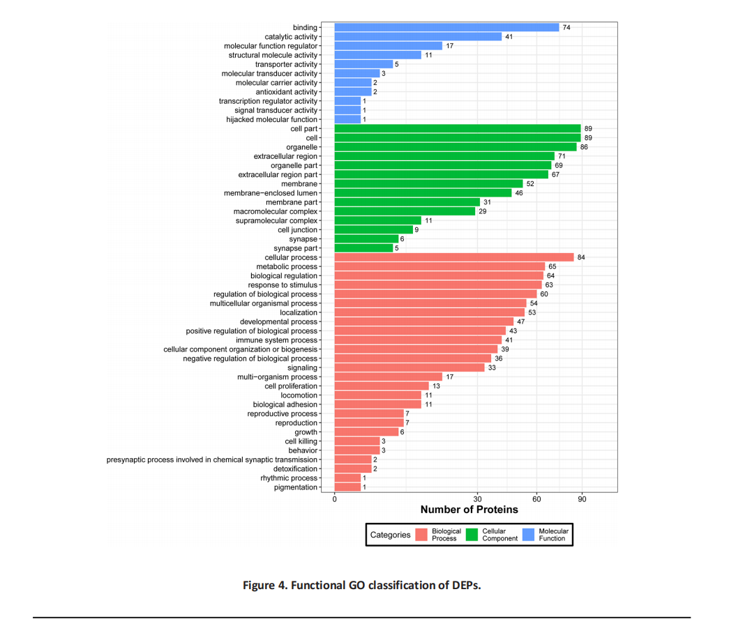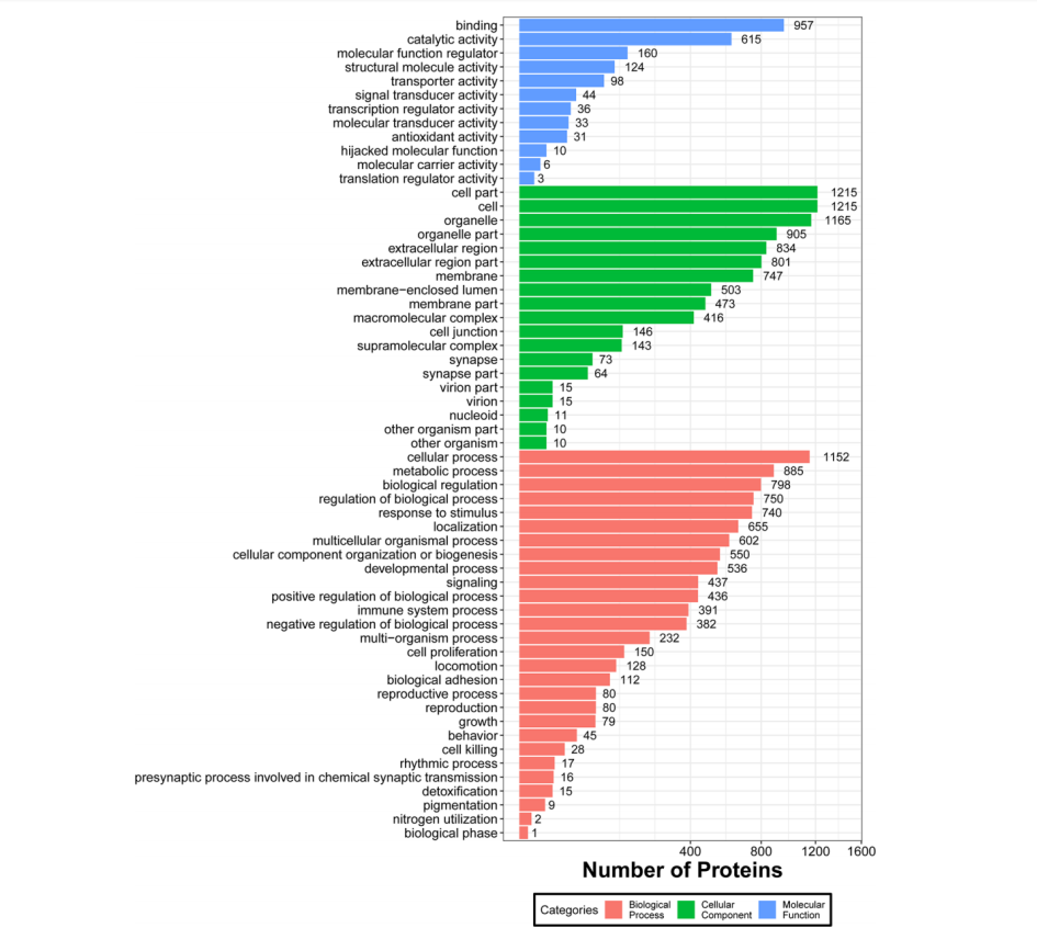 To evaluate the functional significance of all identified proteins, Blast2GO software was used to perform gene ontology (GO) annotation analysis. Protein information and visualization of results are provided in Supplementary Table 4 and Figure 3, respectively. The most enriched biological processes (out of 28 GO