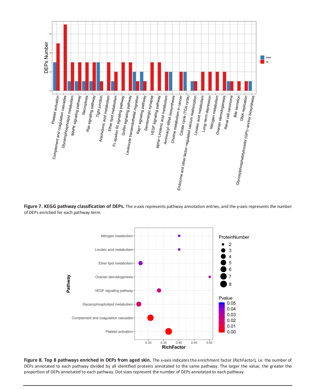 Then, we conducted KEGG enrichment analysis to further characterize the biological functions of the identified DEPs (Supplementary Table 7). Results showed that upregulated proteins were annotated to 25 major pathways. Among these, the most enriched were „complement and coagulation cascade‟ and „platelet activation‟. In turn, downregulated proteins were annotated to 14 major pathways, the most enriched ones being „platelet activation‟ and „tight junction‟ (Figure 7). The 8 highest ranked biological functions for our DEP set are shown in Figure 8. Among these pathways, „complement and coagulation cascades‟ is enriched in SERPINC1, A2M, FGG, FGB, FGA, CLU, PIP, and other proteins whose expression is known to increase with age. On the other hand, several metabolic processes, especially some related to lipid metabolism, were also enriched in various DEPs detected in our aged skin samples.