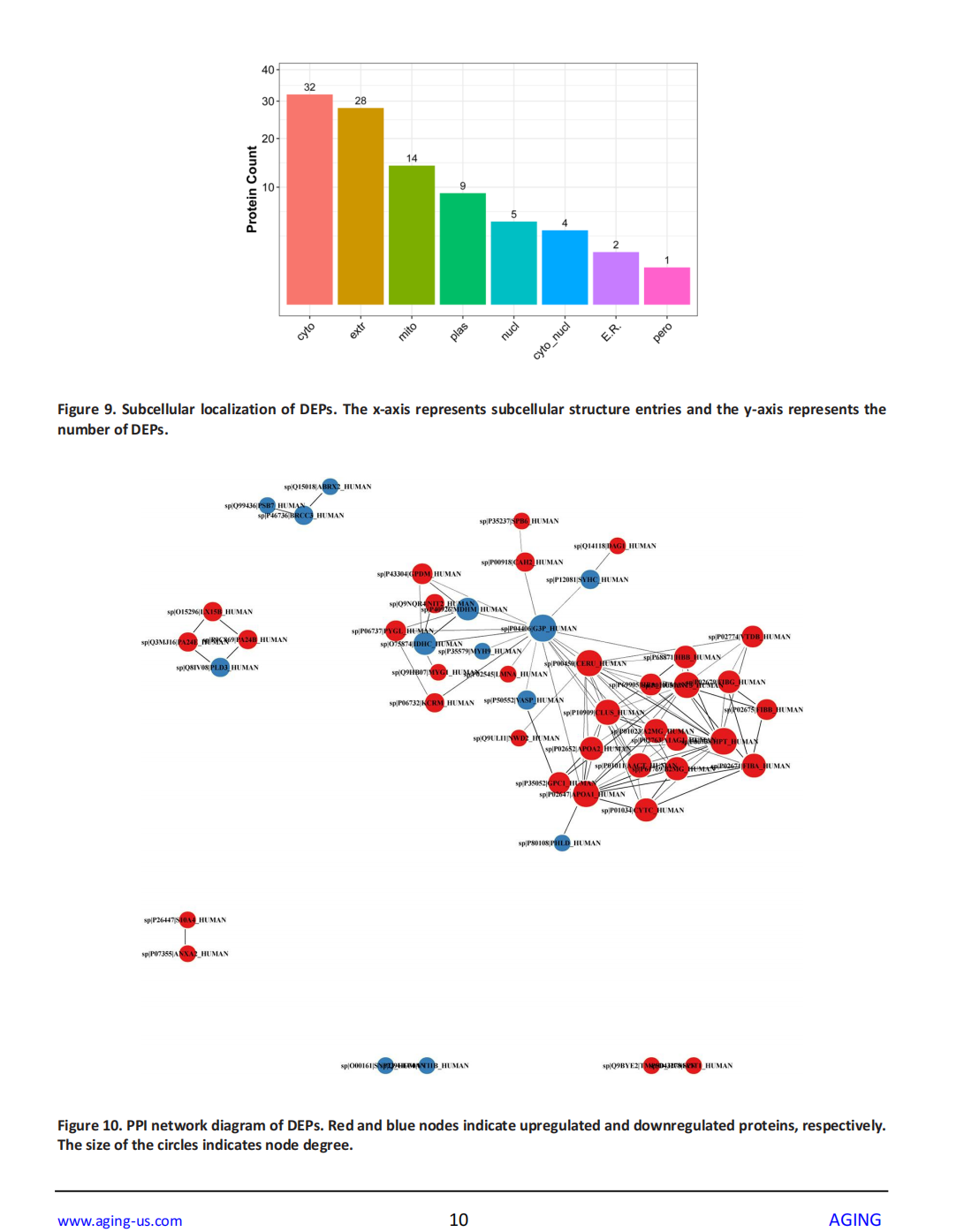 Interestingly, all the DEPs with vesicle trafficking functions identified in this study were downregulated with age. These included synaptosomal-associated protein 23 (SNAP-23), synaptic vesicle membrane protein VAT-1 homolog (VAT-1), vesicle transport through interaction with t-SNAREs homolog 1B (VTI1B), and AP-2 complex subunit mu (AP2M1). SNAP-23 regulates the exocytosis of various inflammatory mediators by mast cells [83]. VAT-1 positively regulates calcium-dependent keratinocyte activation during epidermal repair [84]. VTI1B, syntaxin 8, syntaxin 7, and endobrevin/VAMP-8 form a SNARE complex involved in fusion of late endosomes in vitro. Progressive neurodegeneration was observed in the peripheral ganglia of Vti1b-deficient mice [85, 86]. A recent quantitative proteomics analysis study found that AP2M1 is involved in the transmission of secretory signals produced by senescent cells. This property may be related to the cdk4-EZH2-AP2M1 pathway that regulates the mechanism of senescence escape [87].