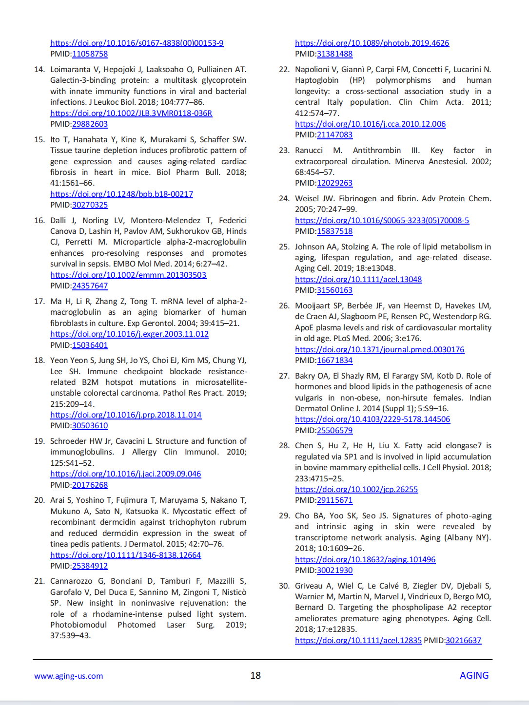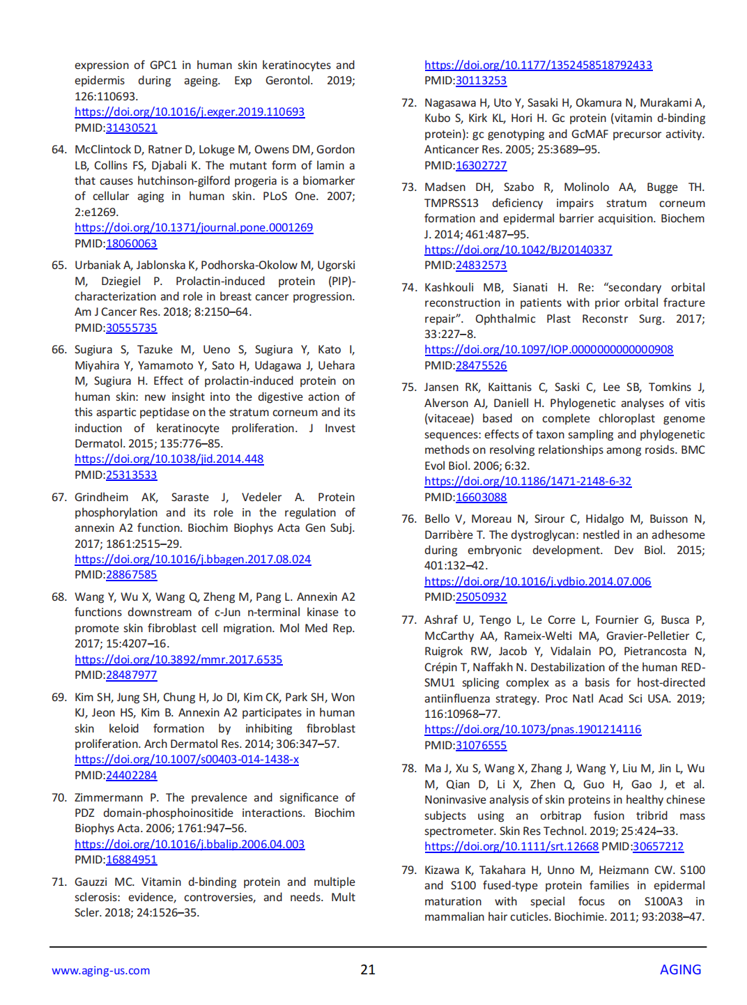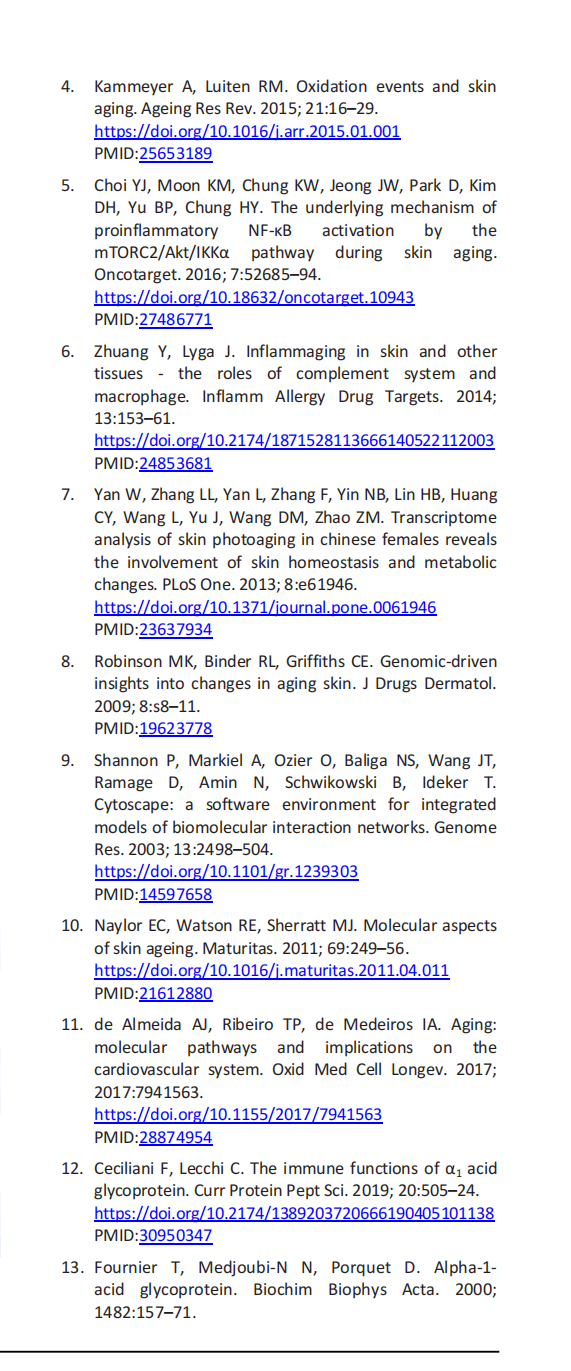1. Rinnerthaler M, Streubel MK, Bischof J, Richter K. Skin aging, gene expression and calcium. Exp Gerontol. 2015; 68:59–65. https://doi.org/10.1016/j.exger.2014.09.015 PMID:25262846