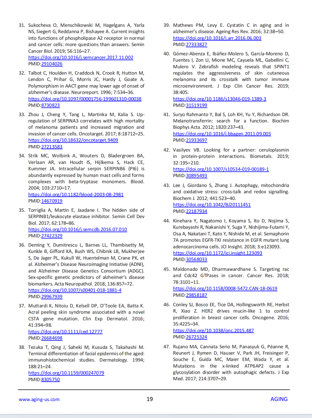Various protease inhibitors were also differentially upregulated in aged skin samples. Alpha-1- antichymotrypsin (SERPINA3) is present in senile  plaques and accelerates the formation of Aβ fibers  associated with Alzheimer's disease (AD) [32]. In addition, SERPINA3 was shown to promote migration and invasion of melanoma cells [33]. Leukocyte elastase inhibitor (LEI/SERPINB1) and SERPINB6 also  function as intracellular serine protease inhibitors that protect cells against damage induced by proteases released into the cytoplasm in response to cellular stress [34, 35]. Research showed that high SERPIB1 and SERPIB6 expression is associated with higher levels of amyloidosis in women with AD [36]. Cystatins function as reversible cysteine protease inhibitors that regulate cathepsin activity, autophagy, immune function, and elicit protection against neurodegenerative diseases. Studies have shown that mutations in the CSTA gene encoding Cystatin-A are associated with acral peeling skin syndrome and exfoliative ichthyosis [37]. Consistent with our findings, a study showed that cystatin-A content in the facial skin of the elderly was much higher than in younger people [38]. Meanwhile, cystatin-C expression, which was also upregulated in our aged skin samples, has been linked to brain aging in previous studies [39]. Kunitz-type protease inhibitor 1 (SPINT1), a type II transmembrane serine protease inhibitor, has been shown to be involved in the development of several types of cancer, such as squamous cell carcinoma and colorectal cancer. Of note, alterations in the SPINT1 gene are highly prevalent in skin cutaneous melanoma (SKCM) patients and may promote metastatic invasion [40].