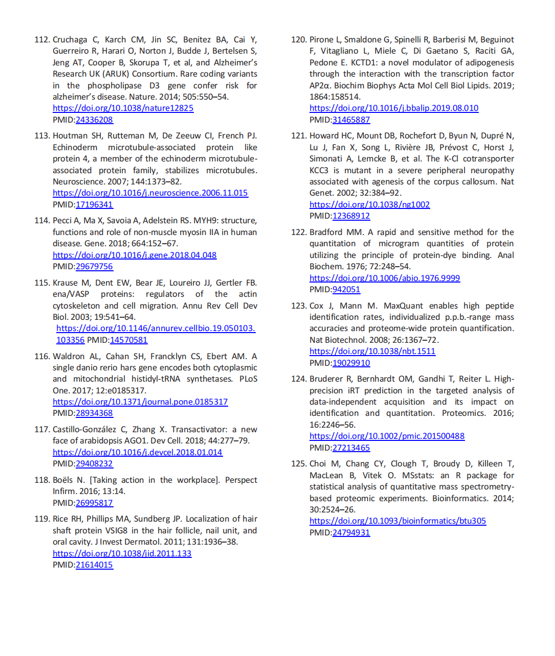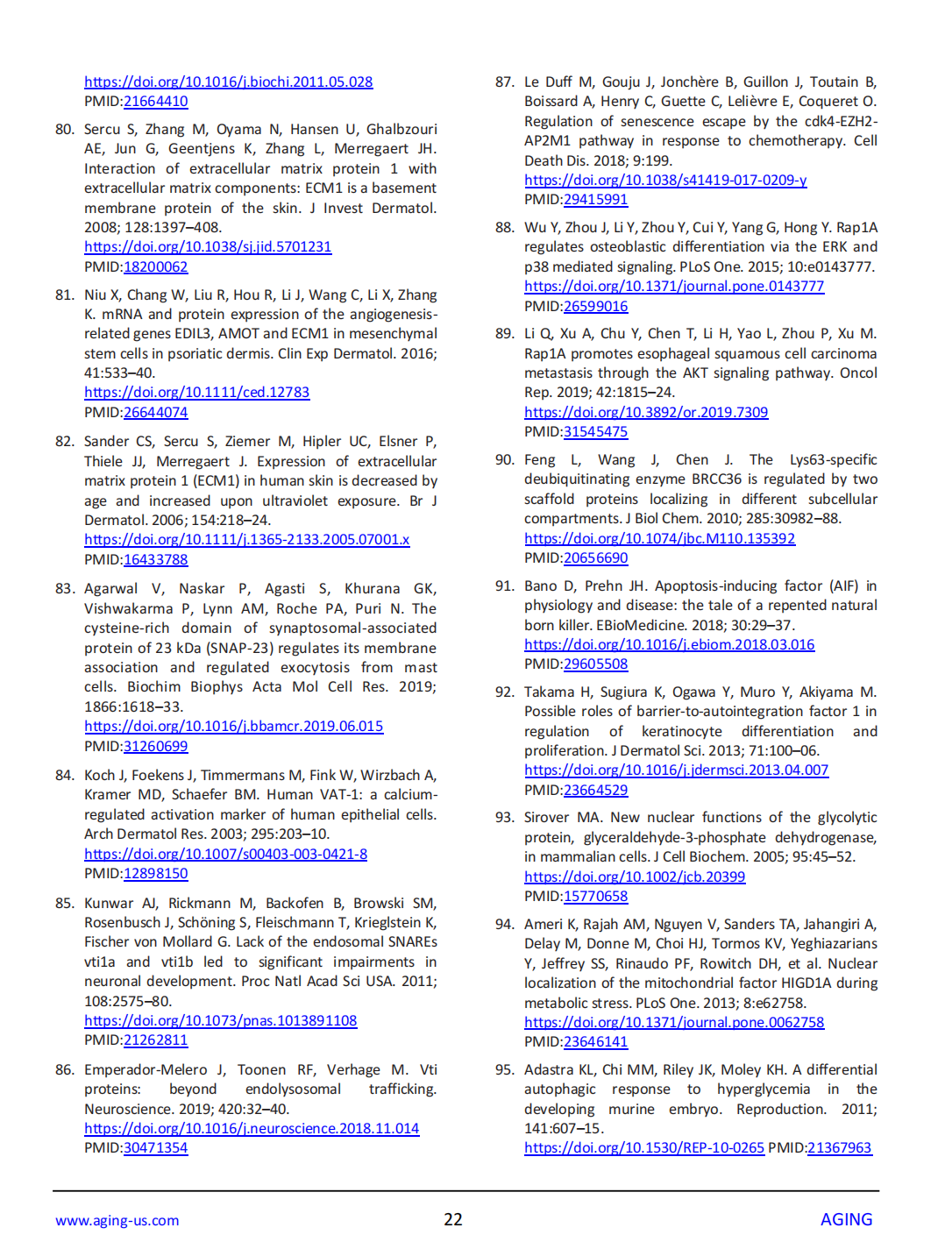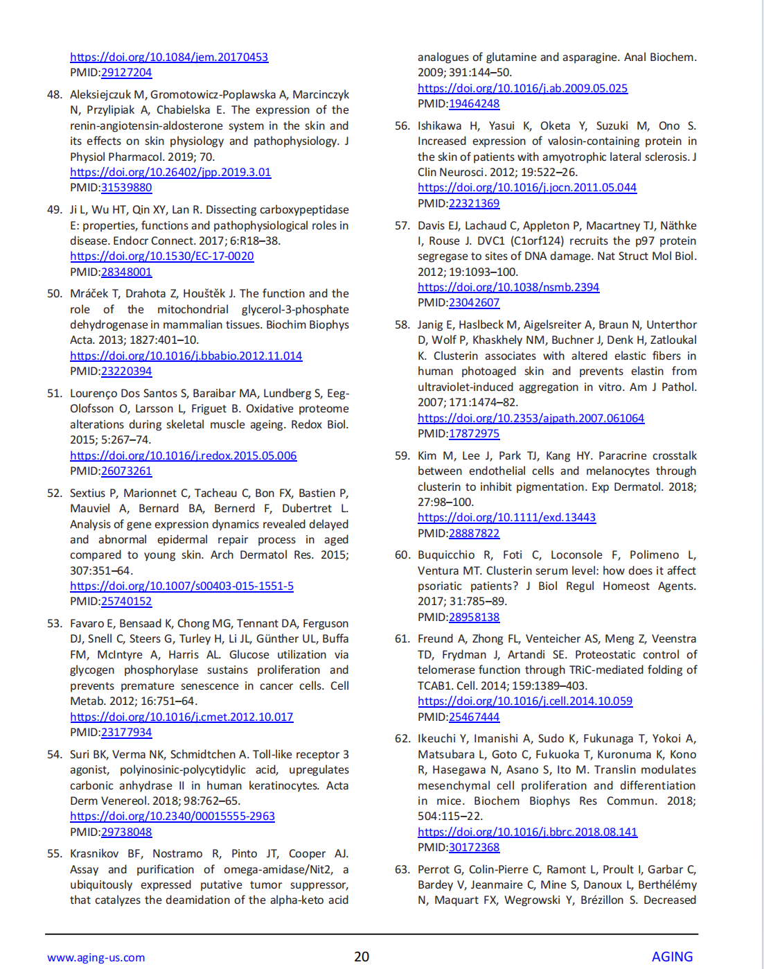 The functions of other DEPs found to be downregulatedin aged skin are less clear. For example, V-set and immunoglobulin domain-containing 8 (VSIG8) may regulate hair follicle keratinization and hair stem differentiation [118, 119]. Potassium channel tetramerization domain-containing 1 (KCTD1) negatively regulates the AP-2 family of transcription factors and promotes adipogenesis [120]. Mice deficient in solute carrier family 12 member 6 (SLC12A6) showed motor dysfunction, peripheral neuropathy, and sensory motor gating defects [121]. Other poorly characterized proteins included acid phosphatase type-7 (ACP7), a metallohydrolase, and BRCA1/BRCA2- containing complex subunit 3 (BRCC3), a component of the BRCC complex with E3 ubiquitin ligase activity.
