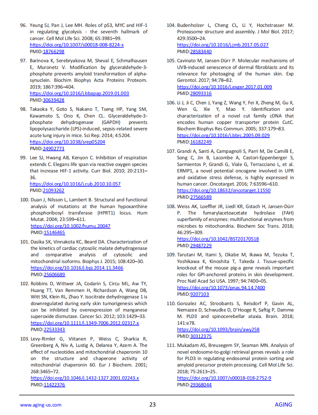 ATP6AP2 participates in the assembly of the vacuolar (V)-ATPase proton pump, thereby controlling proteolysis, autophagy, and glycosylation events. Accordingly, missense mutations in ATP6AP2 lead to decreased V-ATPase activity and defects in autophagy and glycosylation [47, 48]. Carboxypeptidase E (CPE) is involved in the biosynthesis of various neuropeptides and hormones in the endocrine and nervous systems, and is associated with hyperinsulinemia and insulinoma [49]. GPD2 (glycerol 3-phosphate dehydrogenase 2) is located in the inner mitochondrial membrane and catalyzes the conversion of cytoplasmic glycerol 3- phosphate (G3P) into dihydroxyacetone phosphate. It is connected to glycolysis, oxidative phosphorylation, and fatty acid metabolism as an intermediate metabolicenzyme for glycerophosphate shuttling. GPD2 can also promote ROS production at the respiratory chain and hence increase oxidative stress [50]. Creatine kinase, M-type (CKM) is a cytoplasmic enzyme that reversibly catalyzes phosphate transfer between ATP and various phosphagens. Accumulation of oxidatively modified (carbonylated) proteins is a hallmark of cellular and tissue aging, and carbonylation of CKM has been reported in previous studies on skeletal muscle aging [51]. Lactate dehydrogenase B (LDHB) was shown to exert transcriptional modulation after cuticle removal in aging skin, suggesting that it may be related to epidermal repair [52]. Glycogen phosphorylase L (PYGL) is associated with degradation of liver glycogen. Studies have shown that hypoxia induces glycogen metabolism with subsequent PYGL upregulation. In turn, PYGL depletion and concomitant glycogen accumulation lead to elevated ROS levels and induction of p53-dependent senescence [53]. Carbonic anhydrase 2 (CA2) and CA6 catalyze reversible hydration of carbon dioxide, a process related to the regulation of skin pH. In addition, altered CA2 expression has been linked to inflammatory skin diseases [54]. Nitrilase family member 2 (NIT2) has ω- amidase activity and possesses inhibiting effects on tumor cell growth [55]. Valosin-containing protein (VCP), a member of the AAA-ATPase family of proteins, plays a key role in ubiquitin-dependent protein degradation, cell cycle, inhibition of apoptosis, and DNA damage response. Skin immunohistochemical studies on patients with amyotrophic lateral sclerosis (ALS) have shown that increased VCP expression correlates with the progression of this neurodegenerative disease [56, 57].