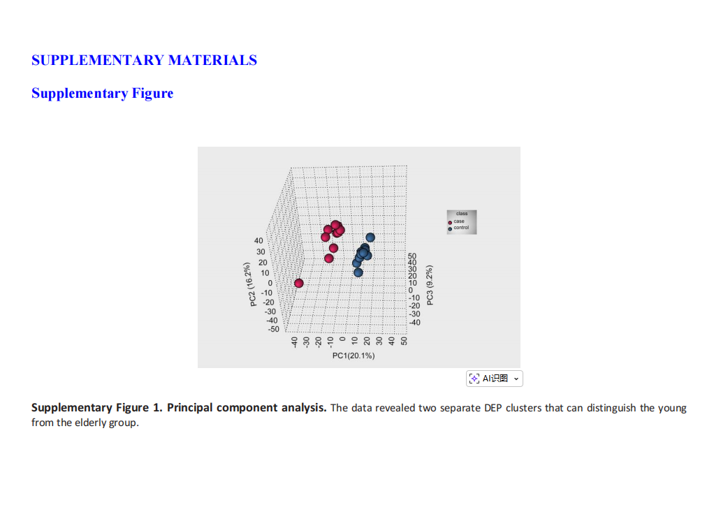 Other skin DEPs downregulated with age participate in cell proliferation, differentiation, and apoptosis. Rap1A, a member of the Ras oncogene family, is a small G protein involved in cell differentiation. Studies have shown that Rap1A regulates osteoblast differentiation through ERK/p38 signaling and promotes the transformation of epithelium to mesenchyme through the AKT signaling pathway [88, 89]. BRISC complex subunit Abraxas 2 (ABRAXAS2) functions as a central scaffold protein that assembles various components of the BRISC complex and retains it in the cytoplasm. It also regulates BRCA1 localization to damaged DNA sites [90]. Apoptosis-inducing factor, mitochondria-associated 1 (AIFM1) is a NADH oxidoreductase that acts as a pro-apoptotic factor following release from the mitochondria [91]. Barrier-to-autointegration factor 1 (BANF1) is involved in the upregulation of keratinocyte proliferation in psoriatic lesions [92]