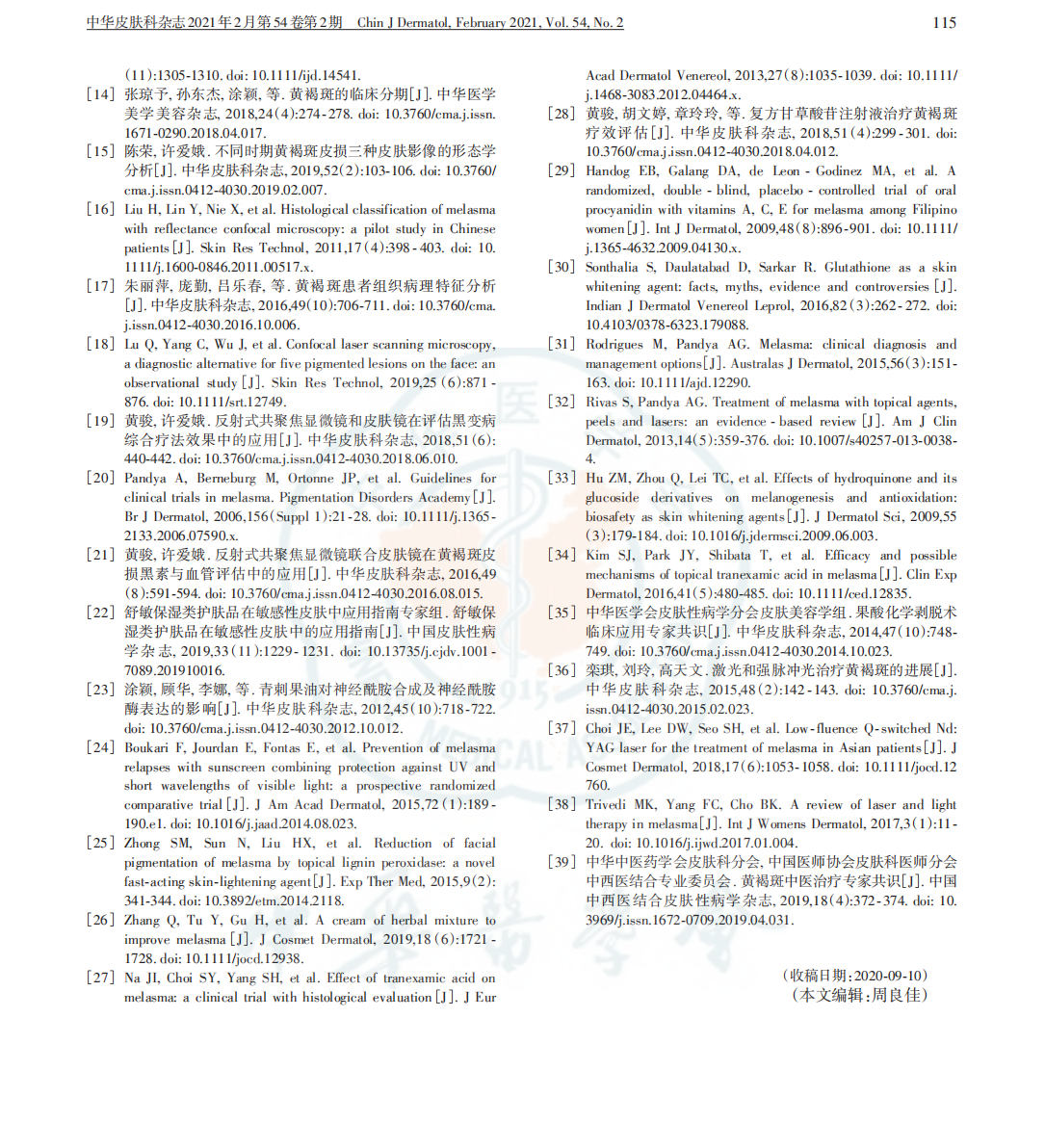 【Key words】 Melasma; Guidelines; Diagnosis; Therapy DOI: 10.35541/cjd.20200900