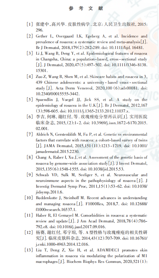 玫瑰痤疮是一种好发于面中部,主要累及面部血管、神经及毛囊皮脂腺单位的慢性复发性炎症性疾病[1] 。据最新的国际各人群流行病学数据荟萃分析,国际患病率平均为5.46%[2]。国内2019年一项10 095例长沙市社区居民调查结果显示,该地区玫瑰痤疮患病率为 3.48%[3];2020 年两所大学共9 227名大学生人群流行病学调查显示,玫瑰痤疮患病率为3.4%[4]。玫瑰痤疮主要临床表现为面部皮肤阵发性潮红、持续性红斑或丘疹、脓疱、毛细血管扩张等,少数患者可出现增生肥大及眼部改变。该病好发于20 ~ 50岁女性[5] ,但儿童和老年人同样可以发病[6] 。
