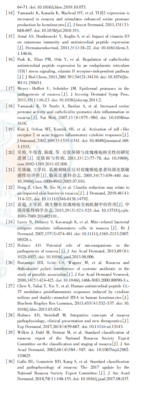 天然免疫反应异常激活在本病炎症形成中发挥重要作用。玫瑰痤疮皮损中,多种天然免疫相关分子如 Toll 样受体 2(Toll⁃like receptor,TLR2)、抗菌肽等表达增加,多种细胞如肥大细胞、巨噬细胞以及中性粒细胞等数量显著增加[13] 。各种外界因素如紫外线、病原生物定植或感染等可促进抗菌肽(如杀白细胞素)的表达,还可通过TLR2[14]、维生素D依赖与非依赖[15] 、内质网应激[16] 等途径直接或间接诱导丝氨酸蛋白酶激肽释放酶 5(kallikrein ⁃related peptidase 5,KLK5)活性增强[17] ,促进表皮抗菌肽cathelicidin转化为活化形式LL⁃37片段,后者可以加重炎症反应和诱导血管生成,是导致玫瑰痤疮炎症反应发生发展的重要机制[18⁃19] 。