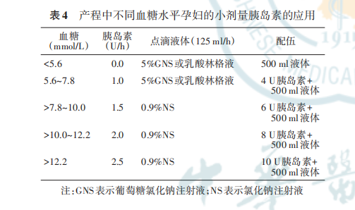 1. 胰岛素的使用方法:每 1~2 小时监测血糖,根据血糖水平维持小剂量胰岛素静脉滴注。妊娠期应用胰岛素控制血糖者计划分娩时,临产前胰岛素正常应用,产程中血糖水平的调整见表 4。如果出现DKA,建议使用输液泵进行治疗。