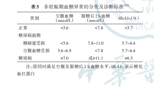 建议所有GDM妇女产后行75 g OGTT,测定空腹及服糖后2 h血糖水平,并按照2020年ADA的标准[5]明 确 有 无 糖 代 谢 异 常 及 其 种 类 。 见 表 5。OGTT 比单纯的 FPG 测定更能够检出糖耐量受损(impaired glucose tolerance,IGT)的妇女。HbA1c水平有可能会由于产时失血、孕晚期严格控制血糖而导致结果不够准确,因此,产后推荐行 75 g OGTT优于FPG和HbA1c检测。