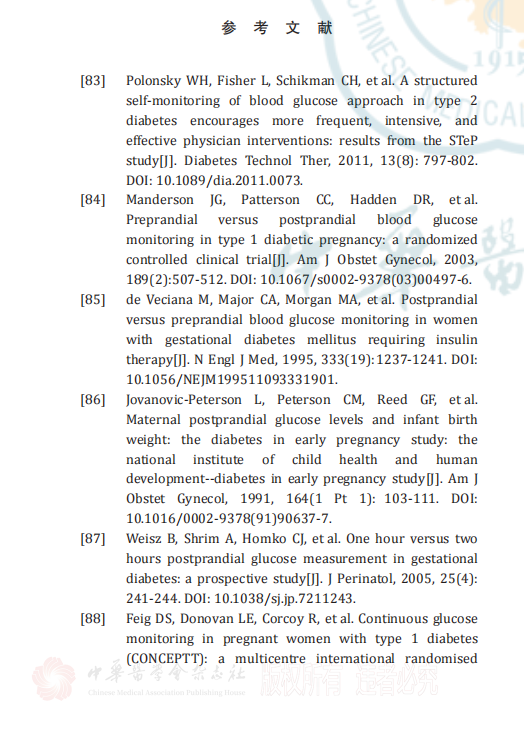 餐后血糖水平有助于了解患者的胰岛功能以及胰岛素抵抗的程度,同时也可指导餐前胰岛素的使用,除此之外糖尿病孕妇餐后血糖的监测有助于达到更好的血糖控制目标[84‑86] 。监测餐后 1 h血糖水平可协助血糖控制,且降低因大于胎龄儿和头盆不称导致的剖宫产率[87] 。目前尚缺乏证据明确自我血糖监测的频率和区分餐后 1 h 或是 2 h 血糖监测的优劣,通常推荐每天监测 4 次,即空腹及三餐后血糖,同时根据血糖的监测情况调整用药。由于餐后血糖峰值在餐后 90 min 左右,因此,餐后血糖的监测时间为餐后1 h或2 h均可,当血糖控制稳定后,监测频率可根据孕周及妊娠情况再行调整。