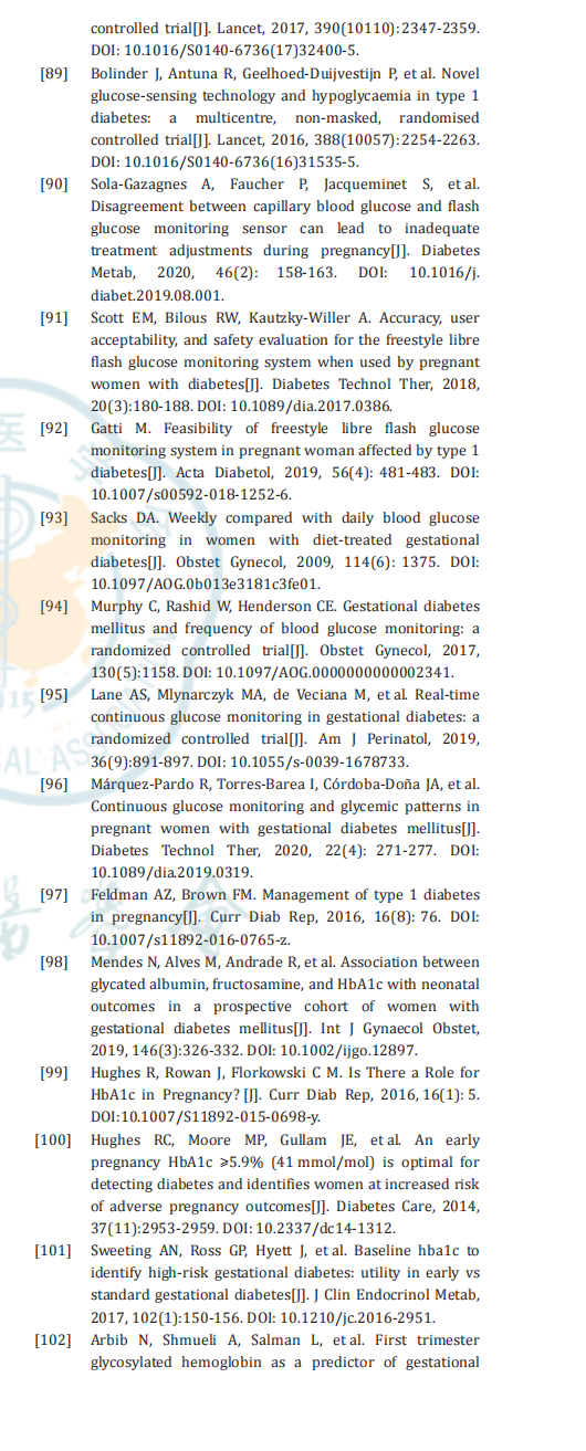 目前,还缺乏高质量的 RCT 研究比较 GDM 和PGDM孕妇不同的空腹和餐后血糖控制目标,本指南推荐的血糖控制目标与2021年美国糖尿病协会(American Diabetes Association,ADA)以及 2018 年美 国 妇 产 科 医 师 协 会(American College ofObstetricians and Gynecologists,ACOG)的推荐[3,48]一致。在临床实践中,对于 T1DM 患者,要达到该血糖控制目标同时又不发生低血糖具有一定的挑战性,尤其是对于反复出现低血糖或无症状低血糖者。如果无法在没有明显低血糖的情况下达到血糖控制目标时,建议根据临床经验和孕妇的个体情况,适当放宽血糖控制目标[97] 。总之,妊娠期需规律监测血糖水平,如血糖水平未能达到上述控制目标,尤其是监测血糖结果中超过 1/3 的血糖值未能达标,则必须增加监测频率。