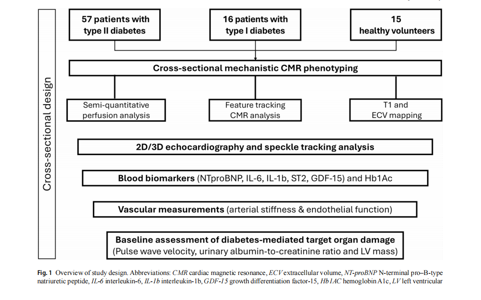 This is a single-center cross-sectional study that included 57 PwT2D, 16 PwT1D and 15 controls without presence of DM and clinically overt CV disease who underwent echo-cardiographic assessment and/or CMR imaging between January 2022 and December 2023 at the Department of Clinical Therapeutics of National and Kapodistrian Univer-sity of Athens (Alexandra General Hospital). Participants were recruited consecutively among those attending the clinic who met inclusion criteria. Figure 1 depicts the study All participants provided written consent for participa-tion in the study. The current study was conducted accord-ing to the principles of the Declaration of Helsinki and the Local Ethics Committee of Alexandra General Hospital approved the study’s protocol (19.07.2021/1379).
