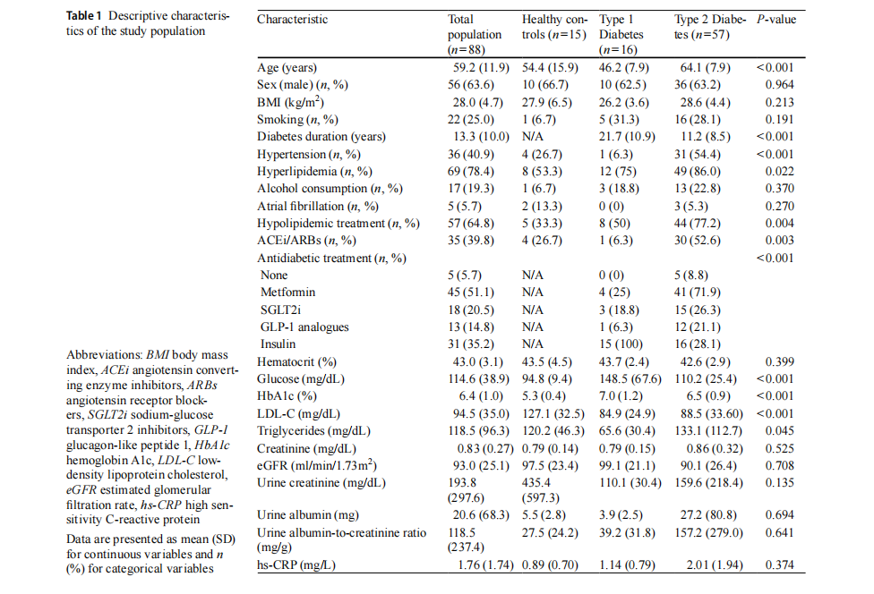 Normality of continuous variables was graphically assessed by histograms and P-P plots. For continuous variables, normally distributed data were expressed as means±stan-dard deviation (SD). Non-normally distributed data were presented as median and interquartile range. Pairwise dif-ferences were evaluated using the independent samples Student’s T test or the Mann-Whitney test for continuous variables and the chi-squared test for categorical ones. To compare variables across more than 2 groups (i.e., PwT2D vs. PwT1D vs. controls), one-way analysis of variance (ANOVA) was employed [29]. For categorical variables, the Chi-Square or Fisher exact test were used to compare the distributions for the two randomized groups.