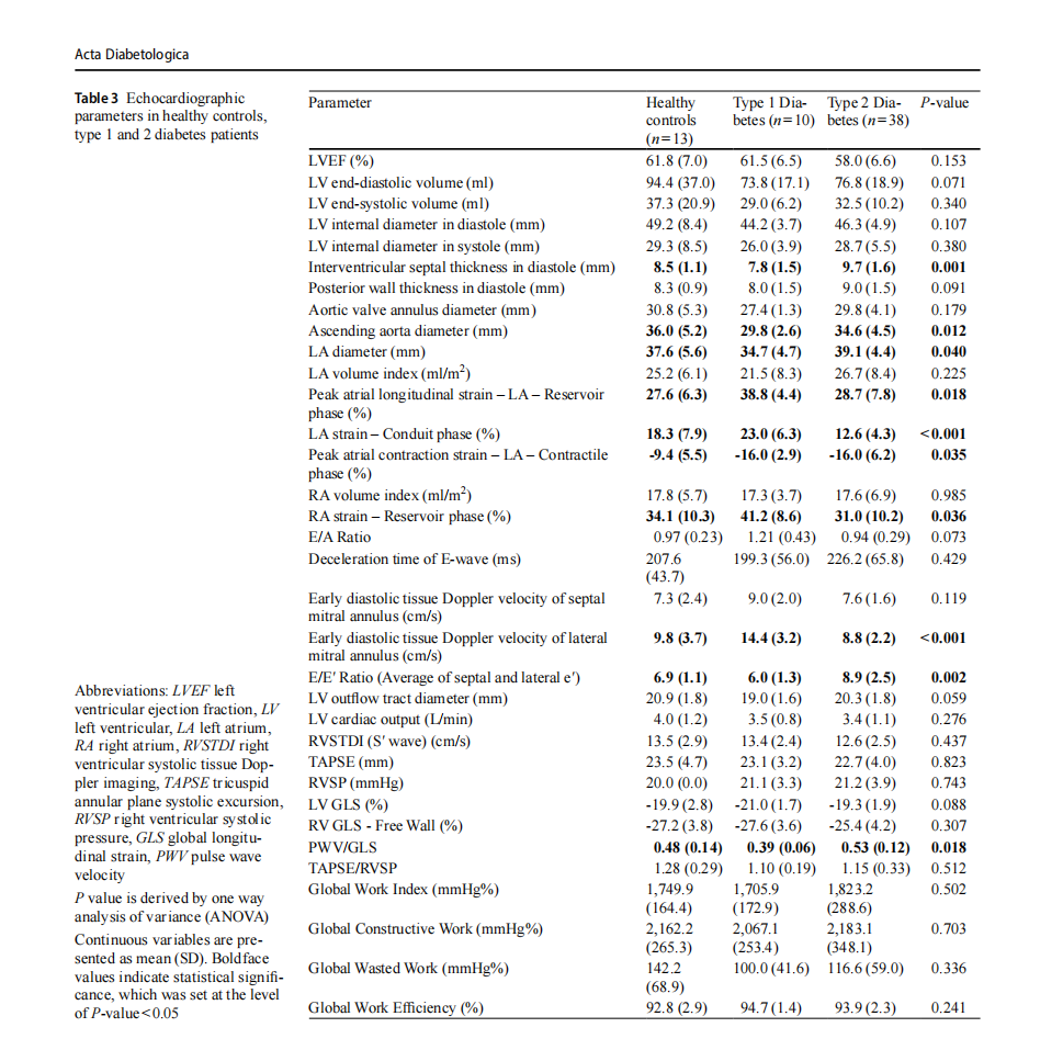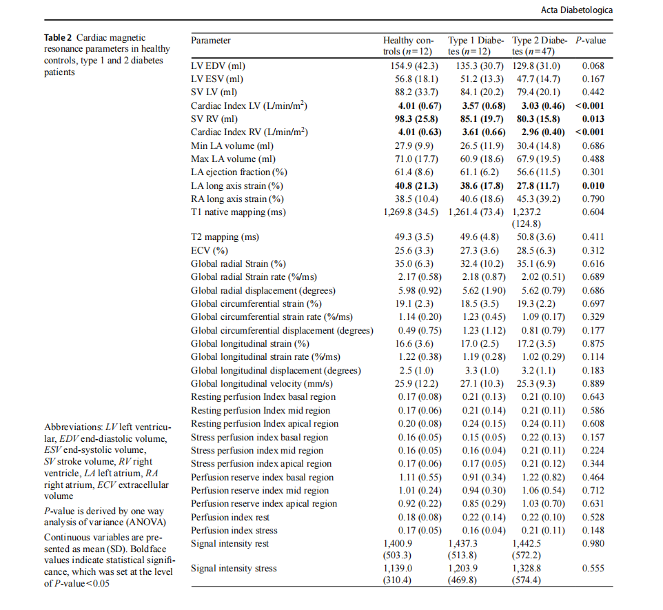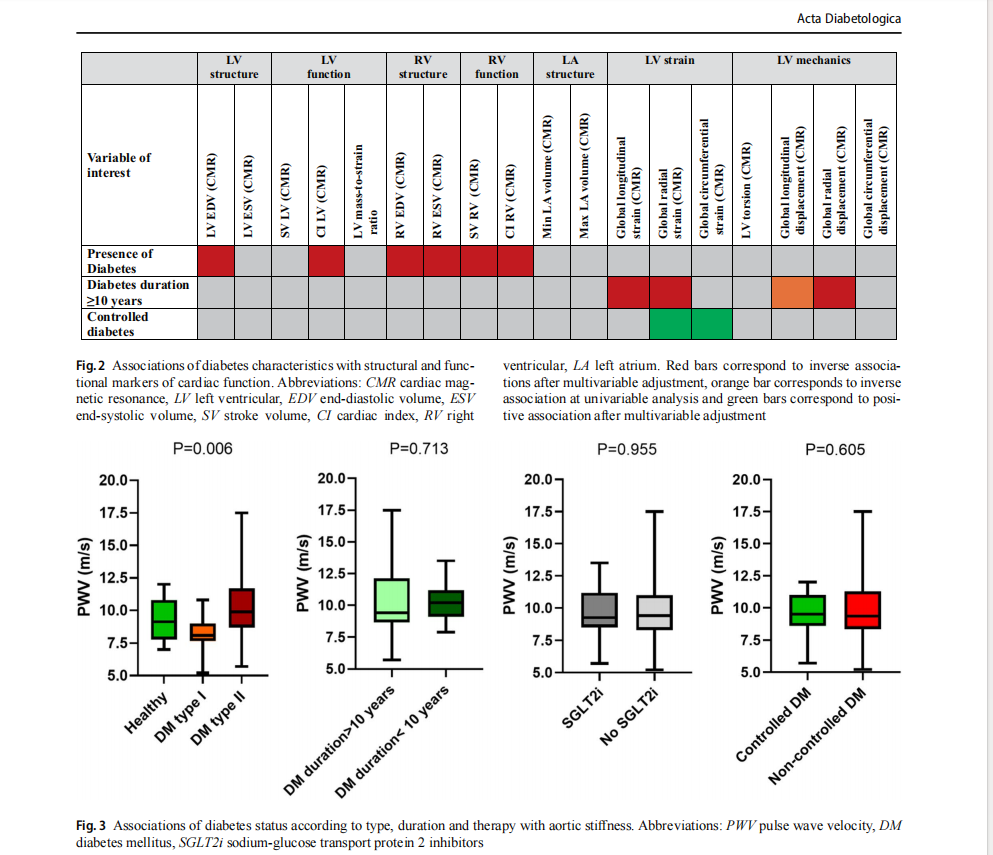 Results PwD had lower cardiac index than controls. Global longitudinal strain (GLS) and global radial strain were lower in both diabetes mellitus (DM) groups, while left atrial strain was most impaired in PwT2D (β-coefficient= − 11.77, P=0.003). DM duration≥10 years was associated with worse GLS (β-coefficient= − 2.18, P=0.033) and right VAC (β-coefficient= − 0.27, P=0.027) after multivariable analysis. While tissue characterization and perfusion indices showed no significant group differences, tight glycemic control in PwD correlated with improved myocardial strain parameters. PwT2D exhib-ited greater arterial stiffness (β-coefficient=1.52, P=0.003). In PwD, elevated non-alcoholic fatty liver disease score cor-related with increased left ventricular mass (β-coefficient=6,195, P=0.022) and decreased left ventricular ejection fraction (LVEF) (β-coefficient= − 3.12, P=0.017). Higher growth differentiation factor levels were associated with reduced LVEF (β-coefficient= − 0.005, P=0.029).