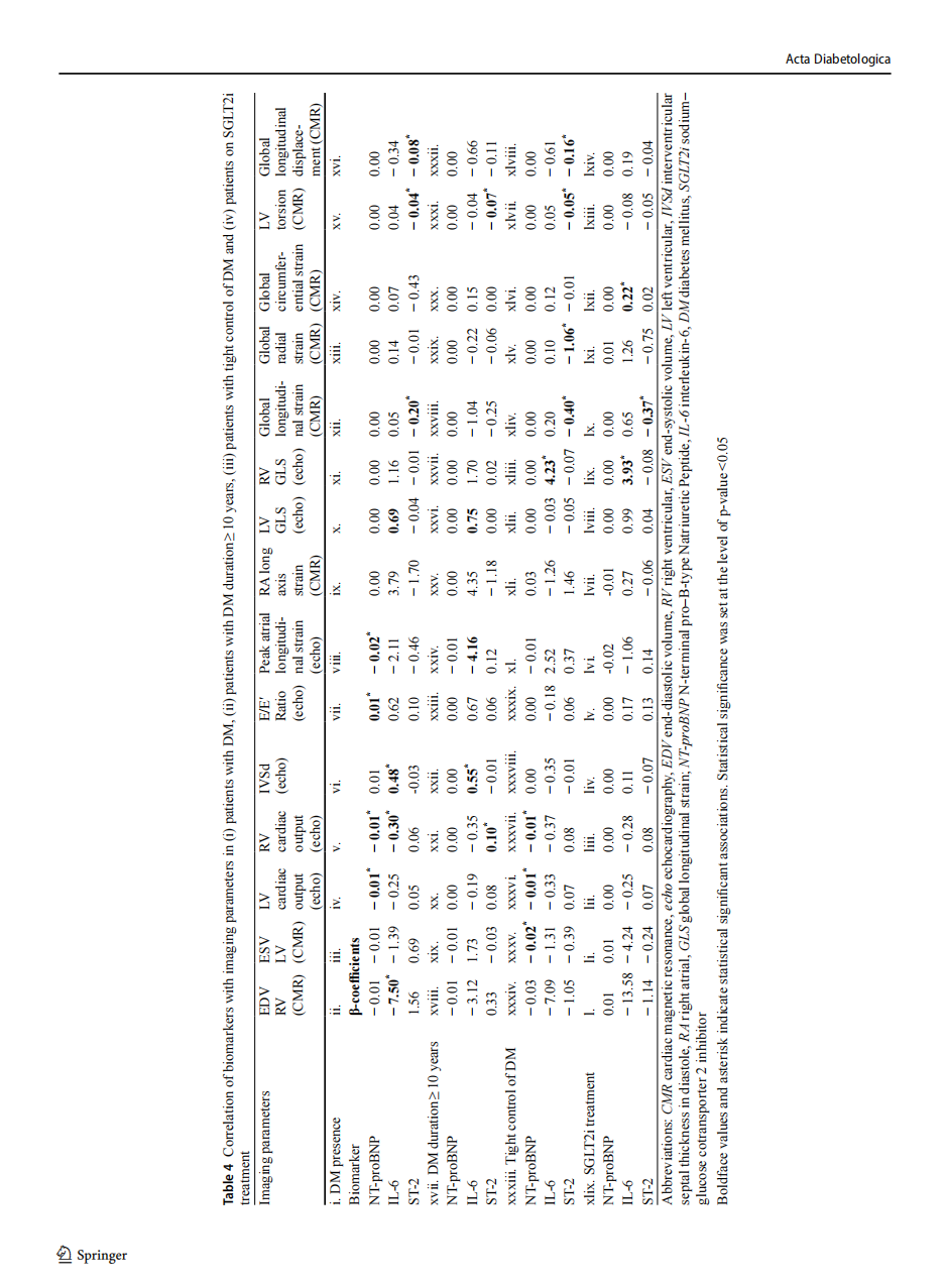 Beyond the advances in imaging that may enable earlier detection of preclinical DCM, DM itself is now increas-ingly recognized as a heterogeneous condition. DM often overlaps with metabolic dysfunction-associated steatotic liver disease and an association between liver fibrosis non-invasive test (LFNITs) and atherosclerotic CV disease has been demonstrated [19, 20]. Recent efforts to disentangle its diverse pathophysiological mechanisms have underscored a common clinical denominator -disease duration- together with overlapping pathways that converge on CV dysfunc-tion [2]. These insights not only refine our understanding of risk trajectories but also underscore the importance of selecting antidiabetic therapies with demonstrated cardio-protective benefits [21] Importantly, longer DM duration has been linked to progressive myocardial remodeling, characterized by greater degrees of myocardial fibrosis and diastolic dysfunction, as assessed by advanced imaging modalities including cardiac T1 mapping and echocardio-graphic strain imaging [22] Furthermore, sodium-glucose co-transporter 2 inhibitors (SGLT2i) have shown promis-ing cardioprotective effects in PwD, potentially attenuating myocardial fibrosis and reducing ECV which can be both visualized through advanced imaging markers like ECV quantification and GLS [23, 24]. These findings highlight the importance of considering both diabetes duration and pharmacologic therapy when evaluating subclinical myo cardial changes in DCM.