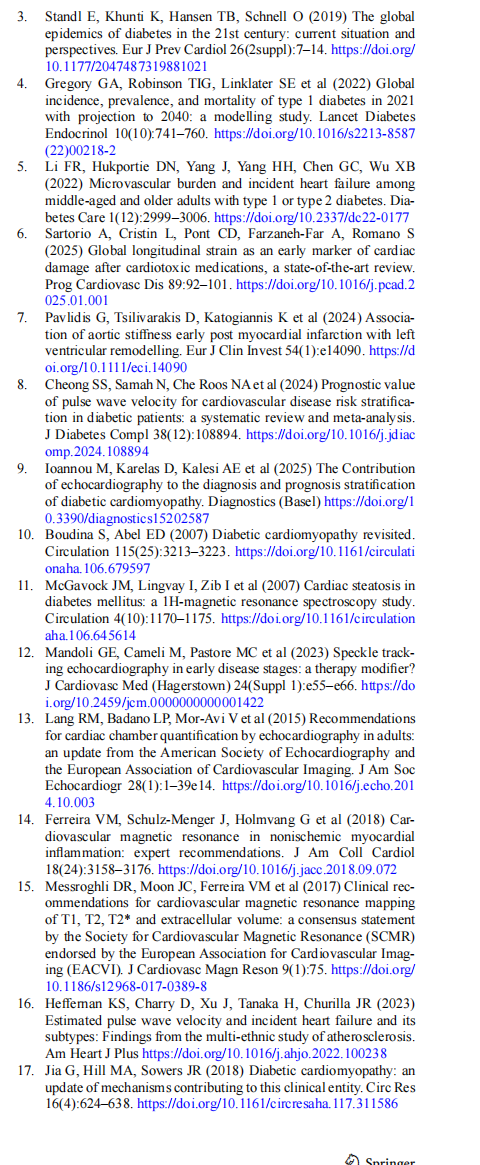 Early identification of subclinical cardiovascular (CV) dysfunction in PwD is critical, as structural and functional abnormalities may precede overt clinical cardiovascular disease (CVD) by several years. In this context, validated non-invasive surrogate imaging biomarkers such as global longitudinal strain (GLS) and pulse wave velocity (PWV) provide sensitive measures of early myocardial dysfunction and vascular remodeling [6, 7]. These parameters have been increasingly recognized as early markers of DCM and may facilitate earlier risk stratification and targeted intervention in asymptomatic high-risk populations [8, 9]. Importantly, the use of validated surrogate imaging endpoints may also facilitate earlier CV risk stratification and support therapeu-tic targeting in high-risk populations such as PwD, where CV damage may develop despite absence of symptoms.