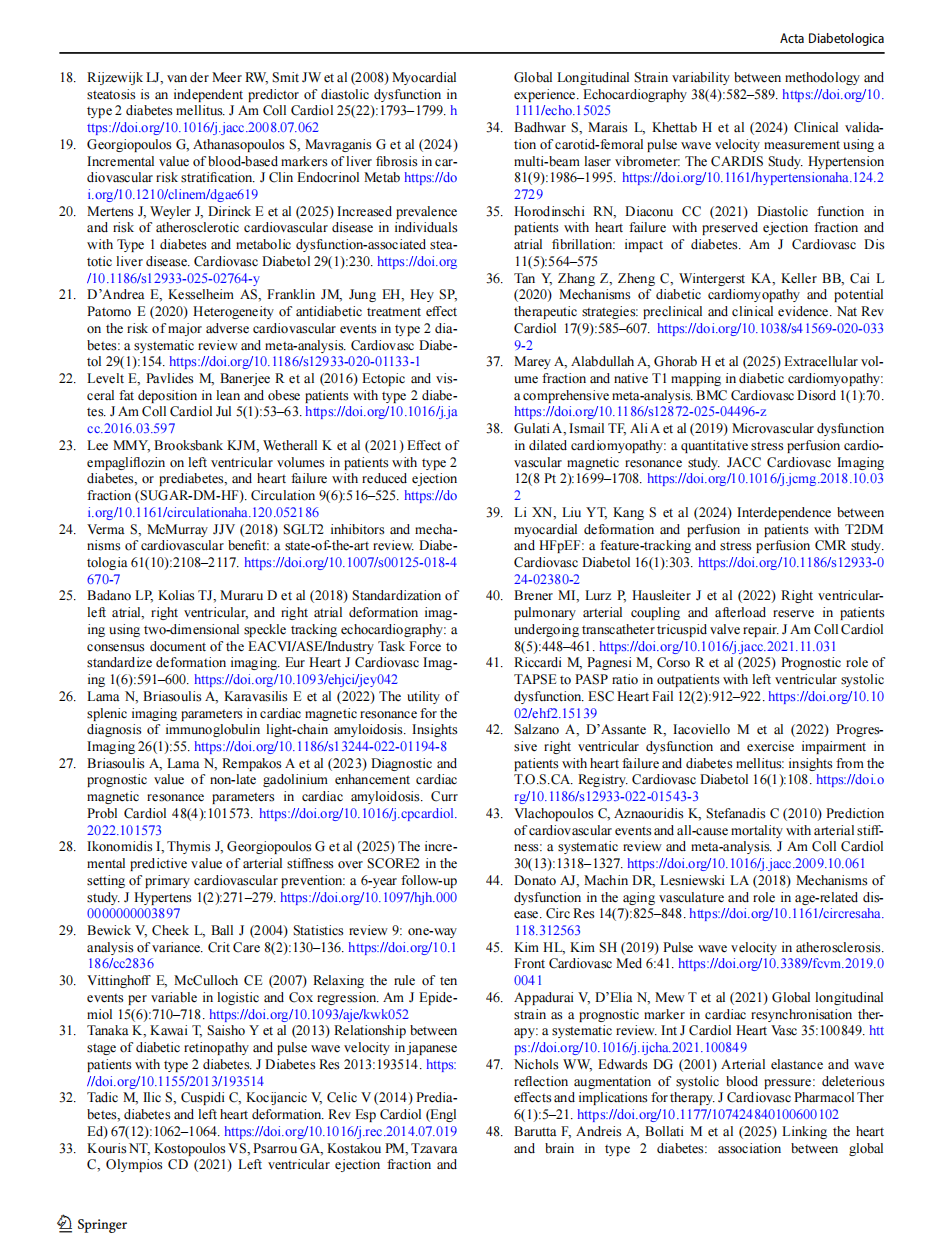 Limitations of the present study are its cross-sectional nature, with inherents bias, and its single-center nature, which may require further multicenter prospective cohort studies to validate our finding; however it ensures consis-tency and standardization. Moreover, the population of our study probably represents an early and subclinical phase of DCM, as the patients included were not evaluated pri-marily for HF symptoms. As a result, we did not capture some of the abnormalities that have been described in more advanced stages of DCM, but we are able to inform on the early changes that may be observed after the diagnosis of DM is made. Future longitudinal analysis of the participants will better inform how our current findings translate to DCM progression and risk. Furthermore, the limited sample size should be acknowledged, albeit it is counterbalanced by the comprehensiveness of imaging and biochemical evaluation. Multiple regression analyses were performed across several imaging, biomarker, and metabolic parameters without for-mal correction for multiple testing, increasing the risk of type I error [55]. Although co-primary outcomes were pre-specified and powered, all other associations observed for secondary imaging, biomarker, and liver fibrosis parameters should be interpreted as hypothesis-generating and require validation in adequately powered prospective cohorts. In addition, although multivariable models were restricted to a limited number of clinically relevant covariates, the relatively small and unbalanced subgroup sizes may still increase the risk of model overfitting and limit the stability of adjusted estimates. Furthermore, CMR tissue character-ization and perfusion analyses were conducted in smaller subgroups and were not primary study endpoints. Therefore, the absence of significant differences in T1, T2, ECV, and perfusion parameters may reflect limited statistical power and potential type II error, particularly for detecting subtle structural or microvascular alterations in this asymptomatic population. The PWV/GLS ratio is an indirect surrogate and does not replace gold-standard VAC assessment derived from pressure–volume loop analysis, such as the ratio of arterial elastance to ventricular elastance [56]. In addition, both PWV and GLS are influenced by loading conditions, blood pressure, heart rate, and measurement variability, which may affect the stability of the ratio [57, 58]. These limitations may be particularly relevant in asymptomatic diabetic populations, where hemodynamic abnormalities are subtle and dynamic, and small variations in either vascular or myocardial measurements may disproportionately influ-ence the calculated ratio [9, 59]. Therefore, the PWV/GLS ratio should be interpreted as an exploratory and hypoth-esis-generating marker rather than a definitive measure of VAC. Finally, although liver fibrosis scores were evaluated, quantitative liver MRI could have provided a more precise assessment of hepatic steatosis and fibrosis burden. Future multimodal imaging studies integrating liver MRI with cardiac imaging may further clarify heart–liver metabolic interactions in diabetes. However, the aim of this study was to explore the association of LFNITs and imaging-defined markers of DCM using advanced CV imaging, irrespec-tively of formal NAFLD diagnosis.