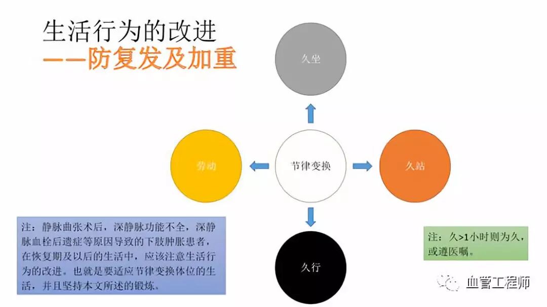 • 尽可能减少诱因,静脉高压,如久坐,久站,久行,疲劳及长期中重体力劳动。
