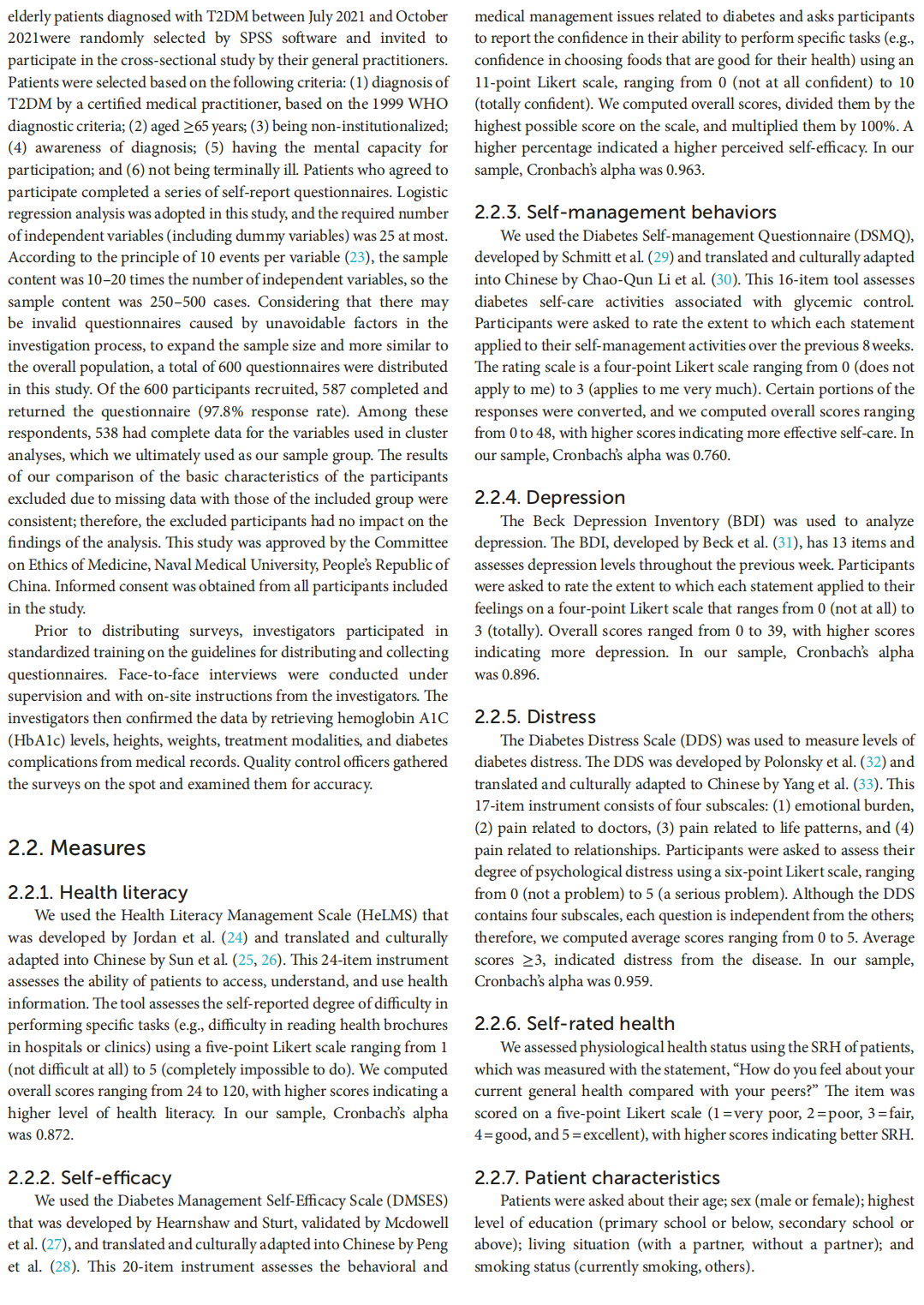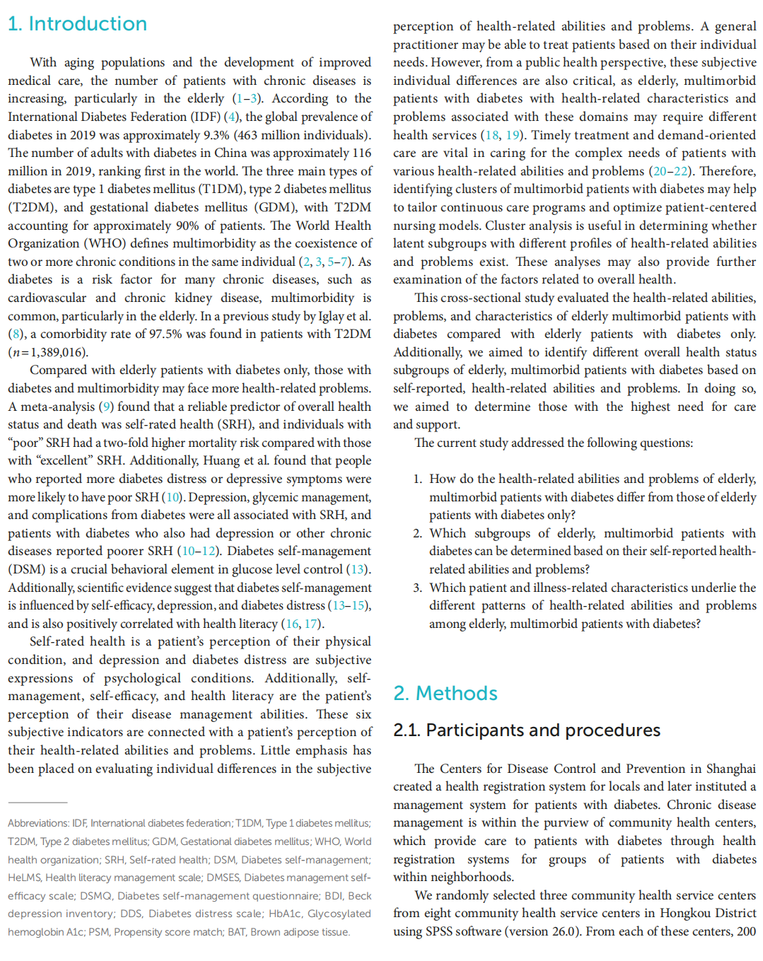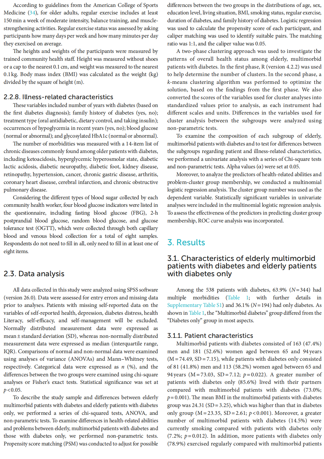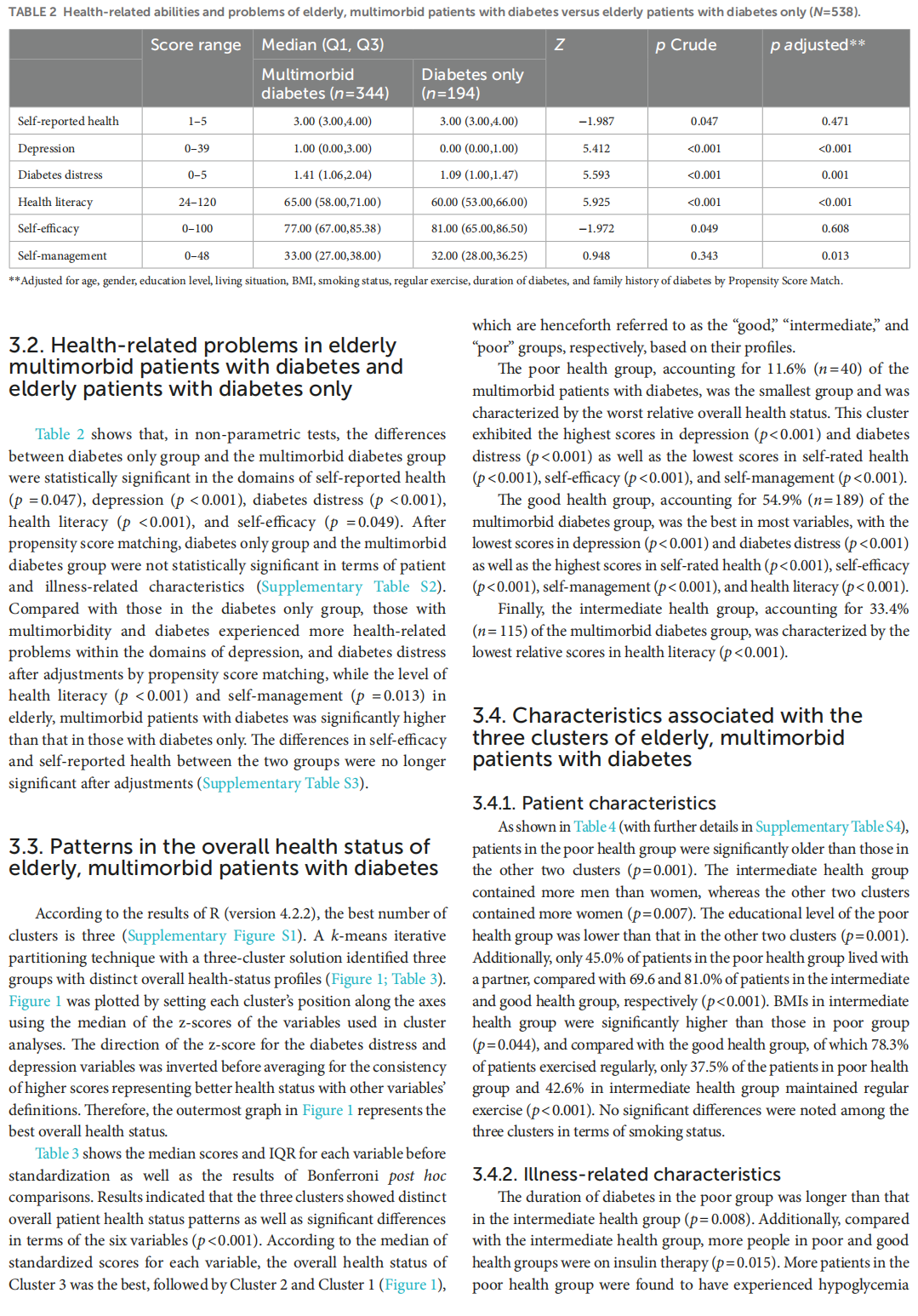Methods: This cross-sectional study included 538 elderly patients with diabetes. The participants completed a series of questionnaires on self-rated health (SRH), diabetes self-management, self-efficacy, health literacy, depression, and diabetes distress. Differences in health-related abilities and problems were compared between elderly patients with diabetes and multimorbidity and those with diabetes only, with adjustments for covariates using propensity score matching. A cluster analysis was also performed to identify the overall health status subgroups of elderly, multimorbid patients with diabetes. Additionally, we  conducted a multinomial logistic regression analysis to examine the predictors of health related abilities and problem-cluster group membership.