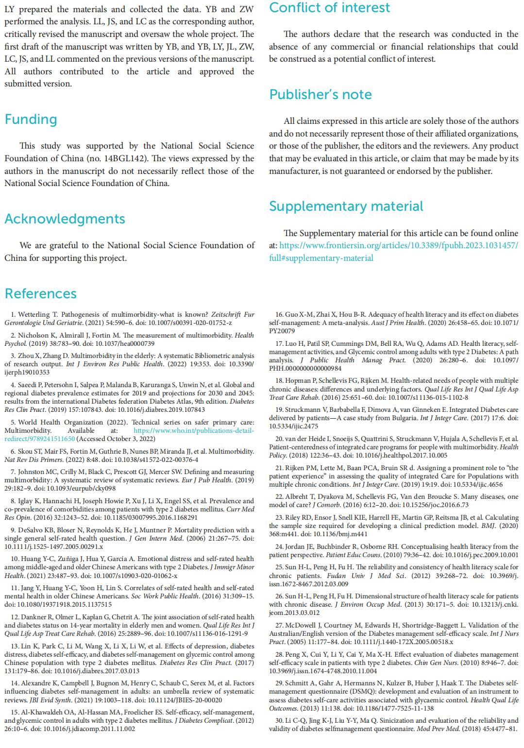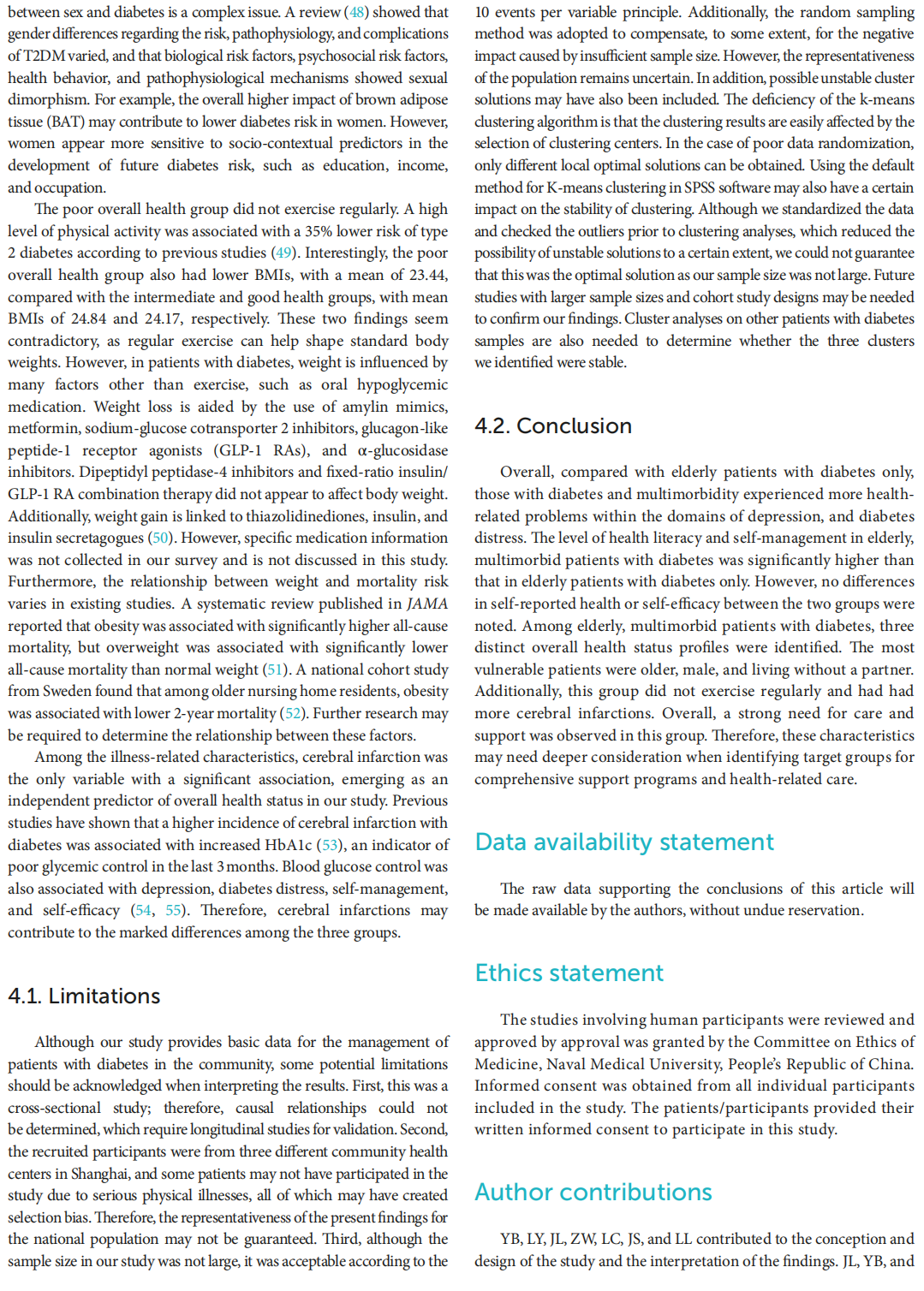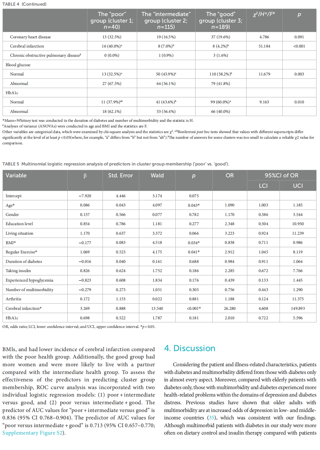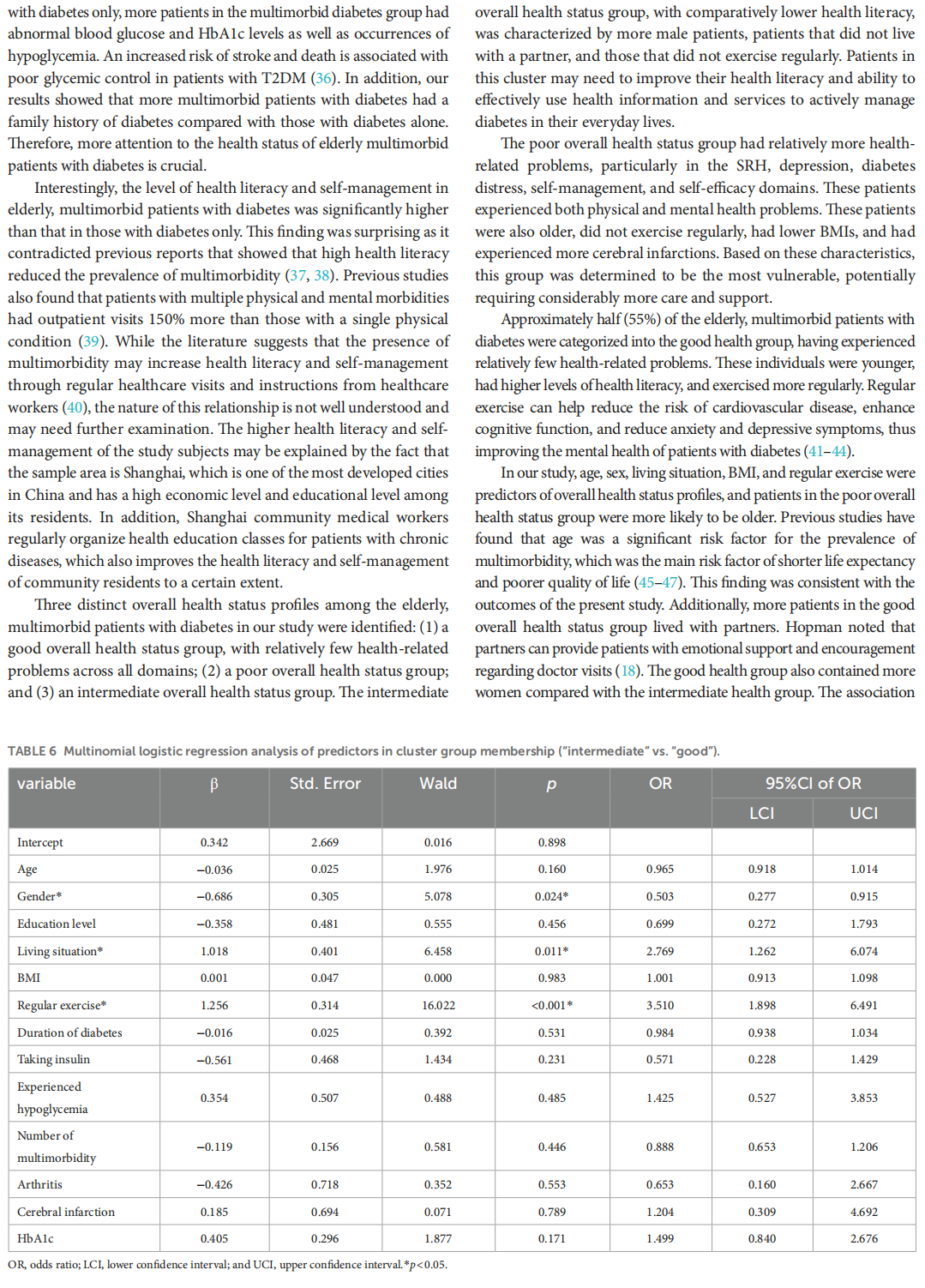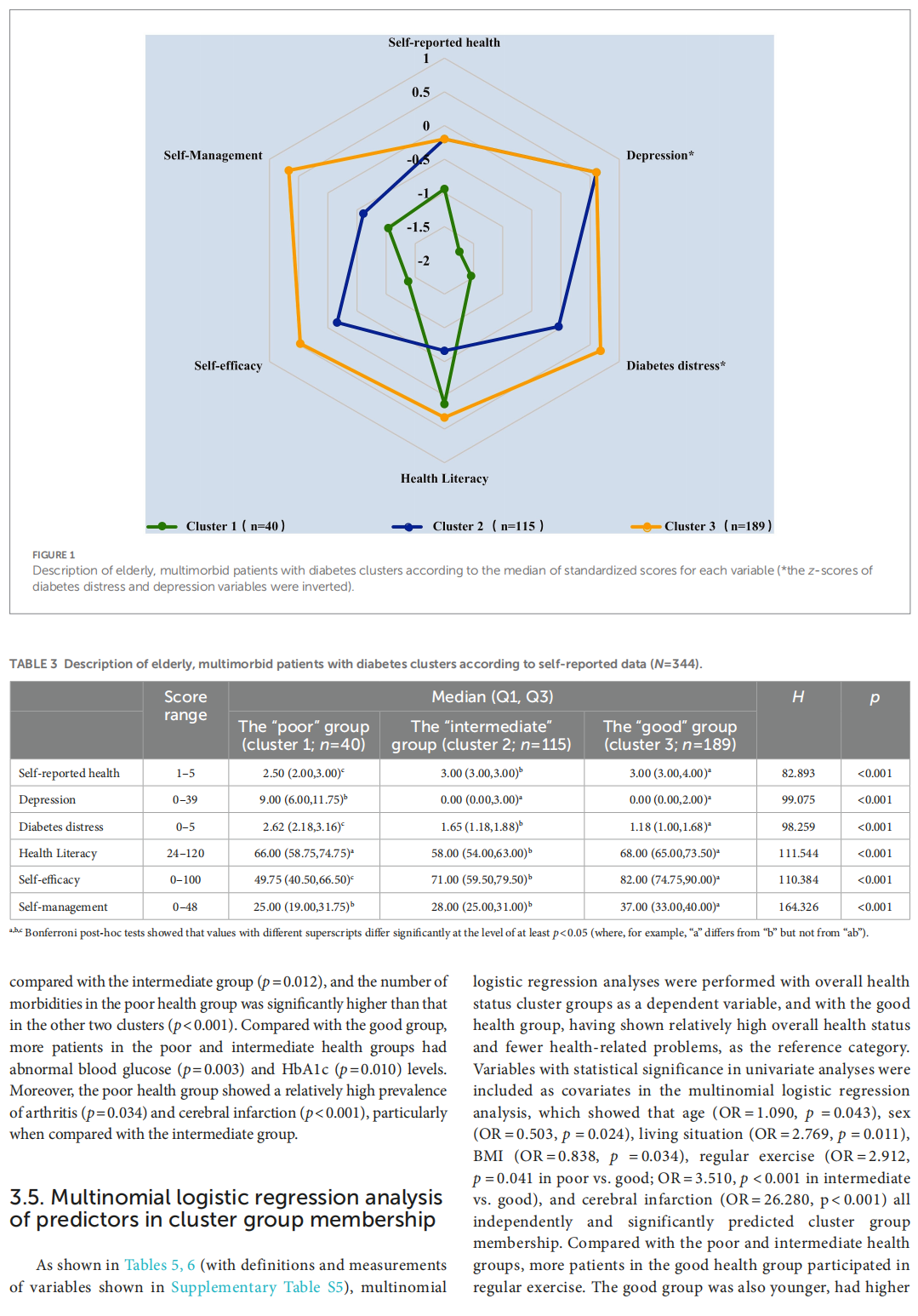 Results: Elderly patients with diabetes and multimorbidity experienced more health-related abilities and problems than those with diabetes only, particularly within the domains of depression (p < 0.001), and diabetes distress. The level of health literacy (p < 0.001) and self-management (p = 0.013) in elderly, multimorbid patients with diabetes was also significantly higher than that in elderly patients with diabetes only. Cluster analysis of elderly, multimorbid patients with diabetes revealed three distinct overall health status clusters. Multinomial logistic regression analysis indicated that age (OR = 1.090, p = 0.043), sex (OR = 0.503, p = 0.024), living situation (OR = 2.769, p = 0.011), BMI (OR = 0.838, p = 0.034), regular exercise (OR = 2.912, p = 0.041 in poor vs. good; OR = 3.510, p < 0.001 in intermediate vs. good), and cerebral infarction (OR = 26.280, p < 0.001) independently and significantly predicted cluster membership.