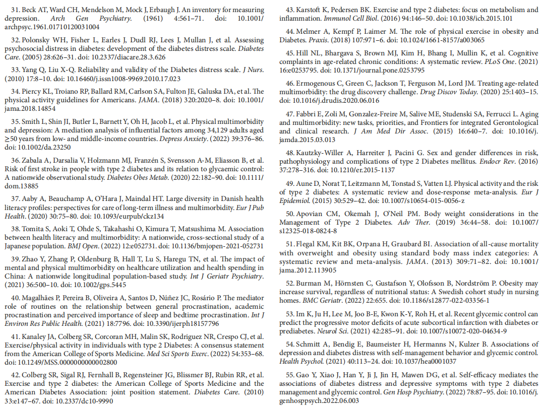 Conclusion: Compared with elderly patients with diabetes only, those with diabetes and multimorbidity experienced more health-related abilities and problems within the domains of depression, and diabetes distress. Additionally, the level of health literacy and self-management in elderly, multimorbid patients with diabetes was significantly higher than that in those with diabetes only. Among the multimorbid diabetes group, old age, male sex, living without a partner, slightly lower BMIs, not exercising regularly, and experiencing cerebral infarctions were all positively correlated with worse overall health status.